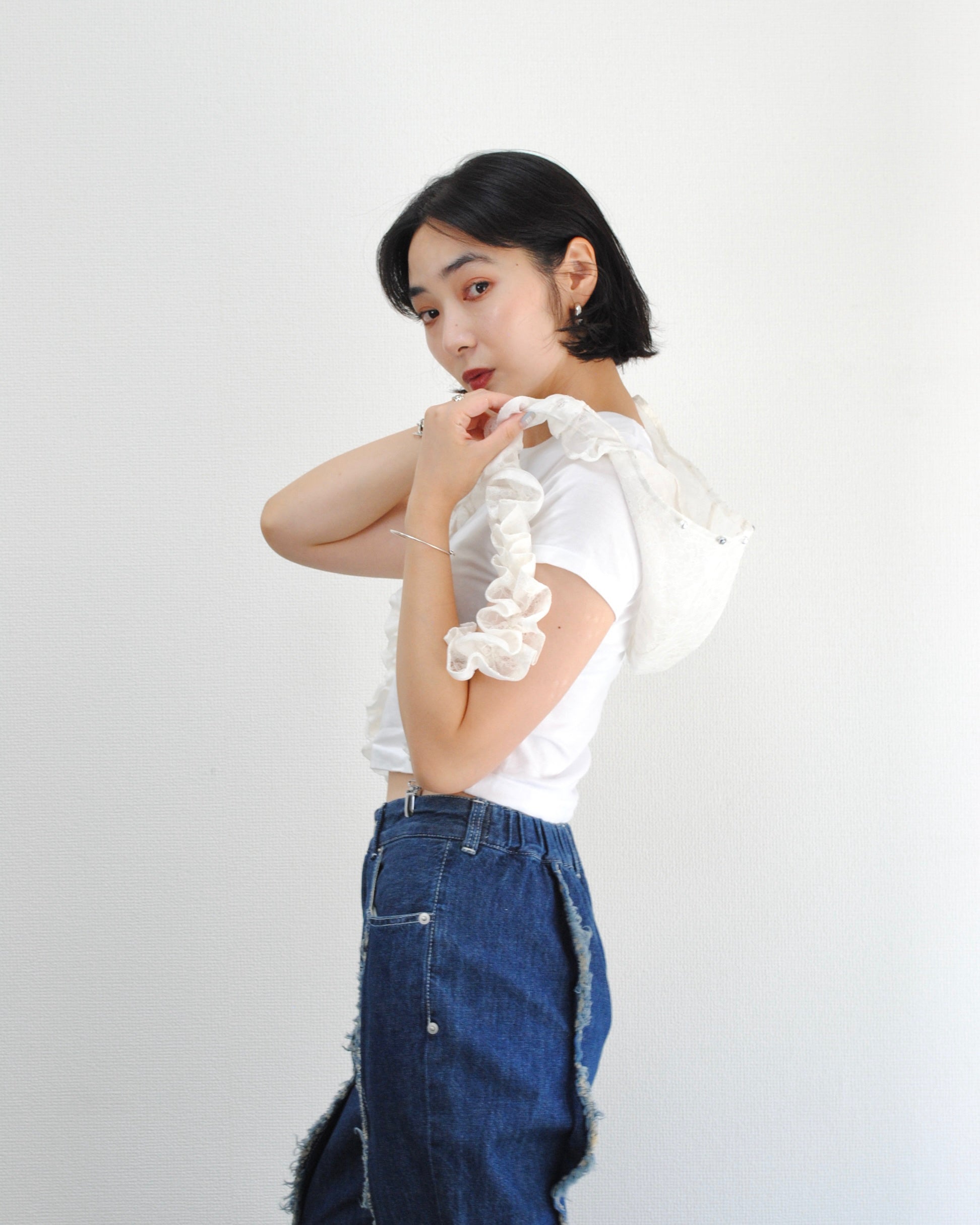 両側の紐はギャザーを寄せ、羽のようなふわっとしたデザインに。