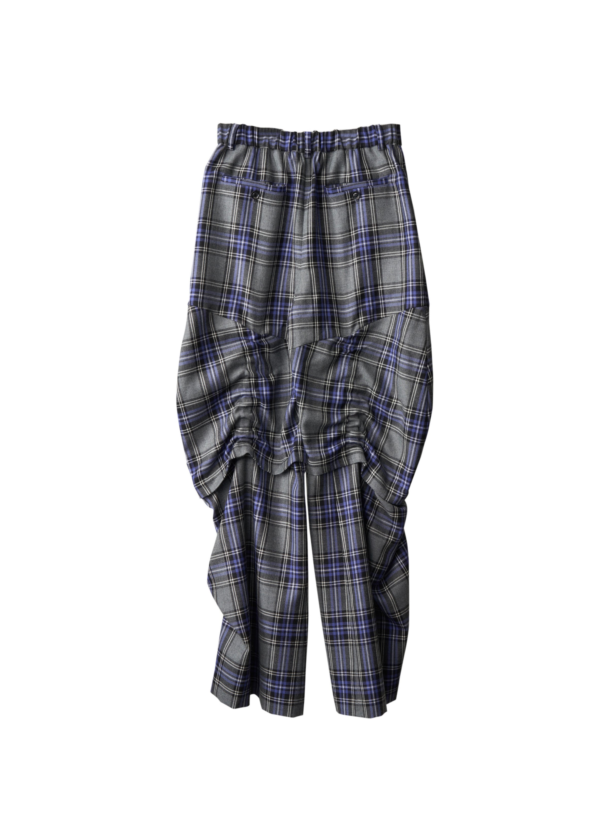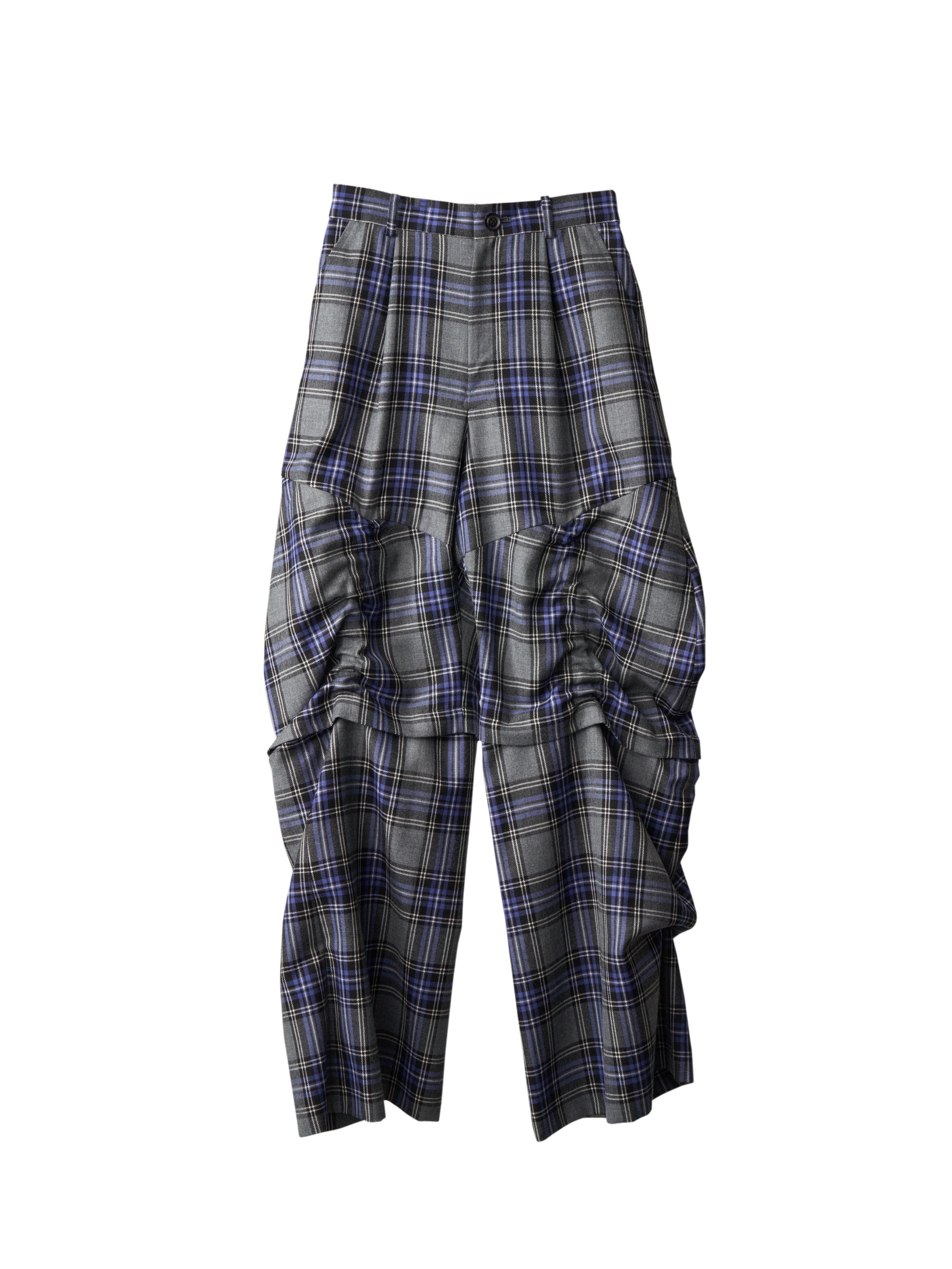 紫が印象的なウールのタータンチェック素材を使用したを使用した、シルエットに動きのあるスラックス。ボタンは本水牛ボタンを使用。①ハーフパンツ(内側のサイドにある紐は上側のボタンに留めることでしまうことができる。)②裾パーツ内側ボタンに中パーツのテープを留めることで丈とシルエットを少しアレンジできる。