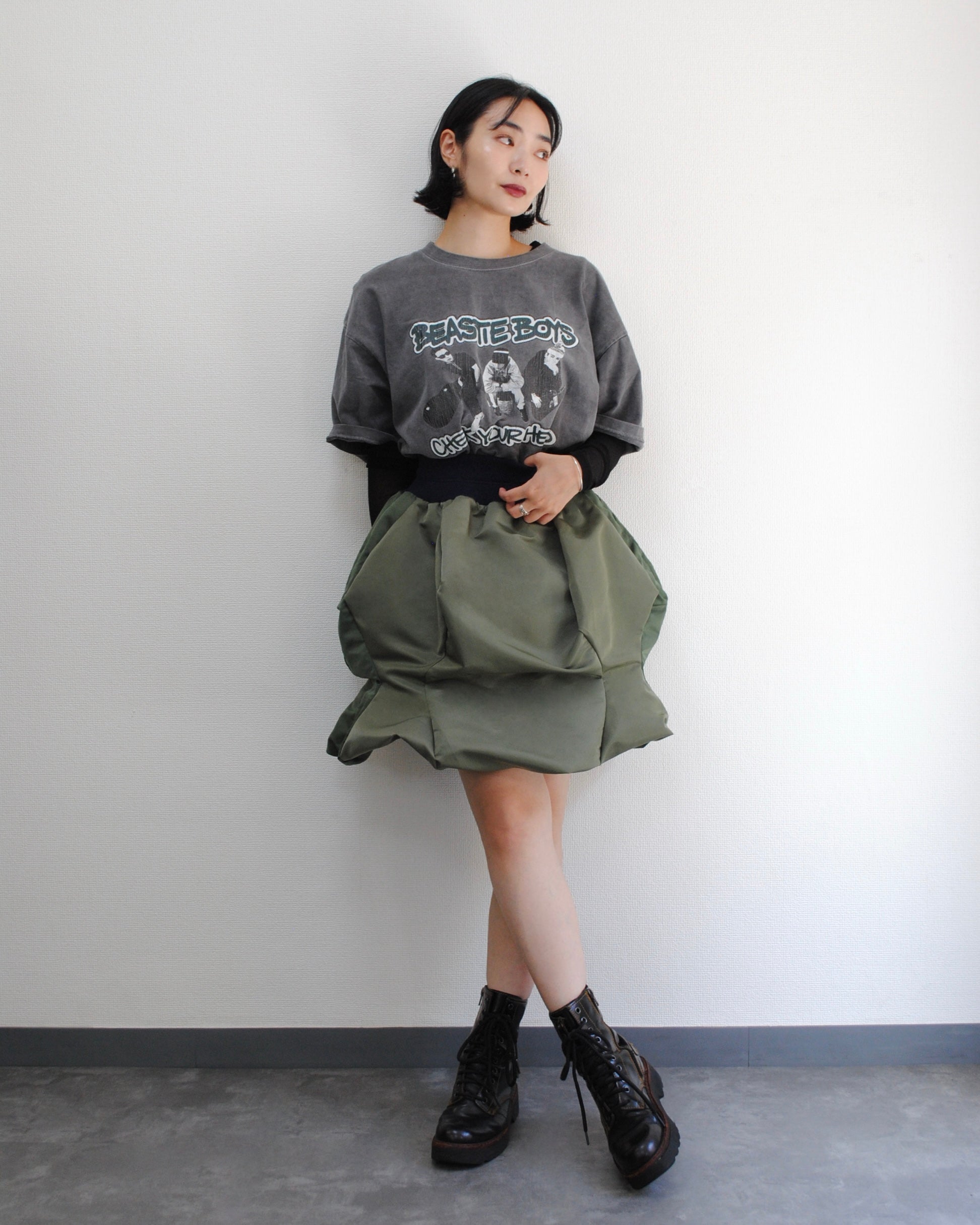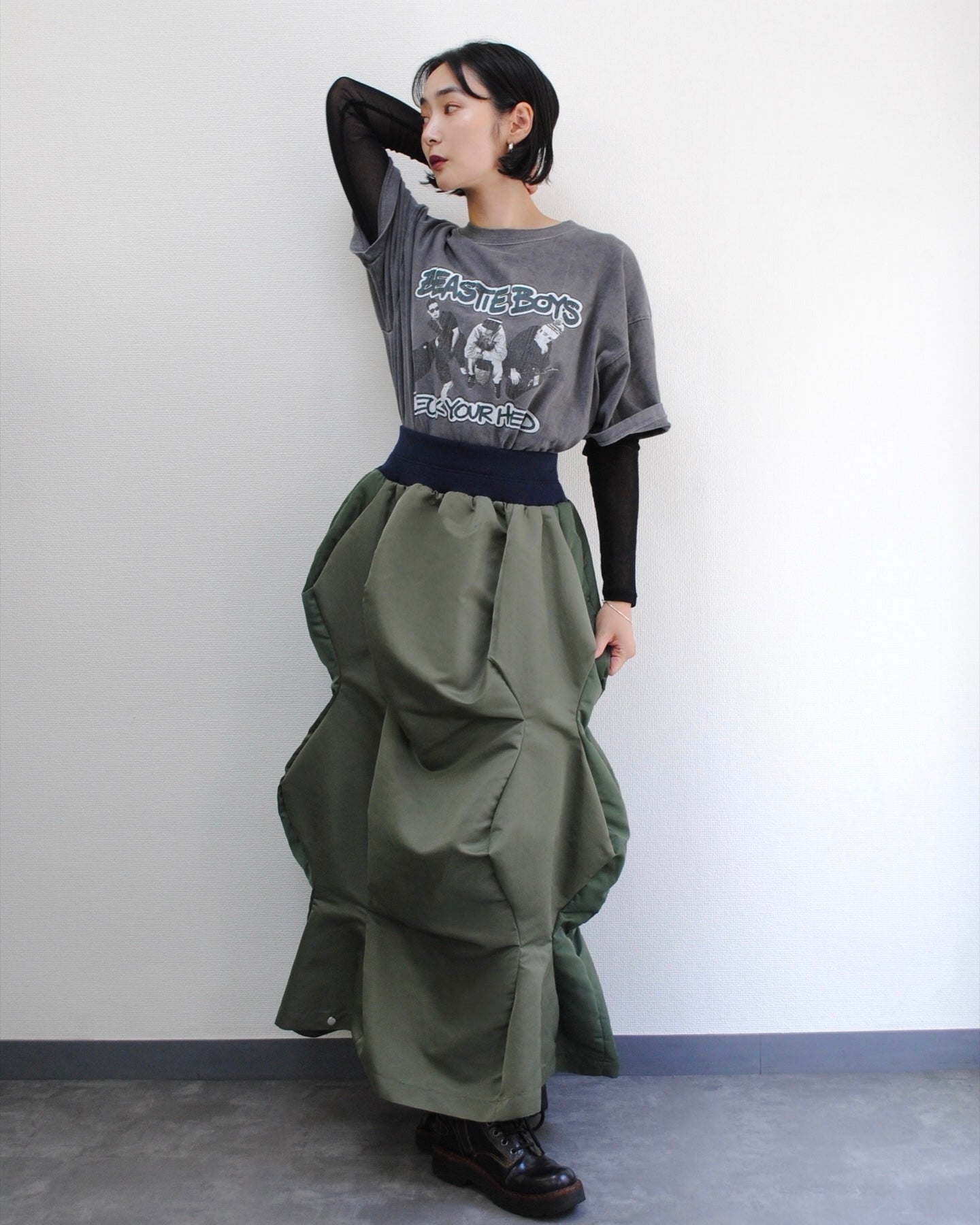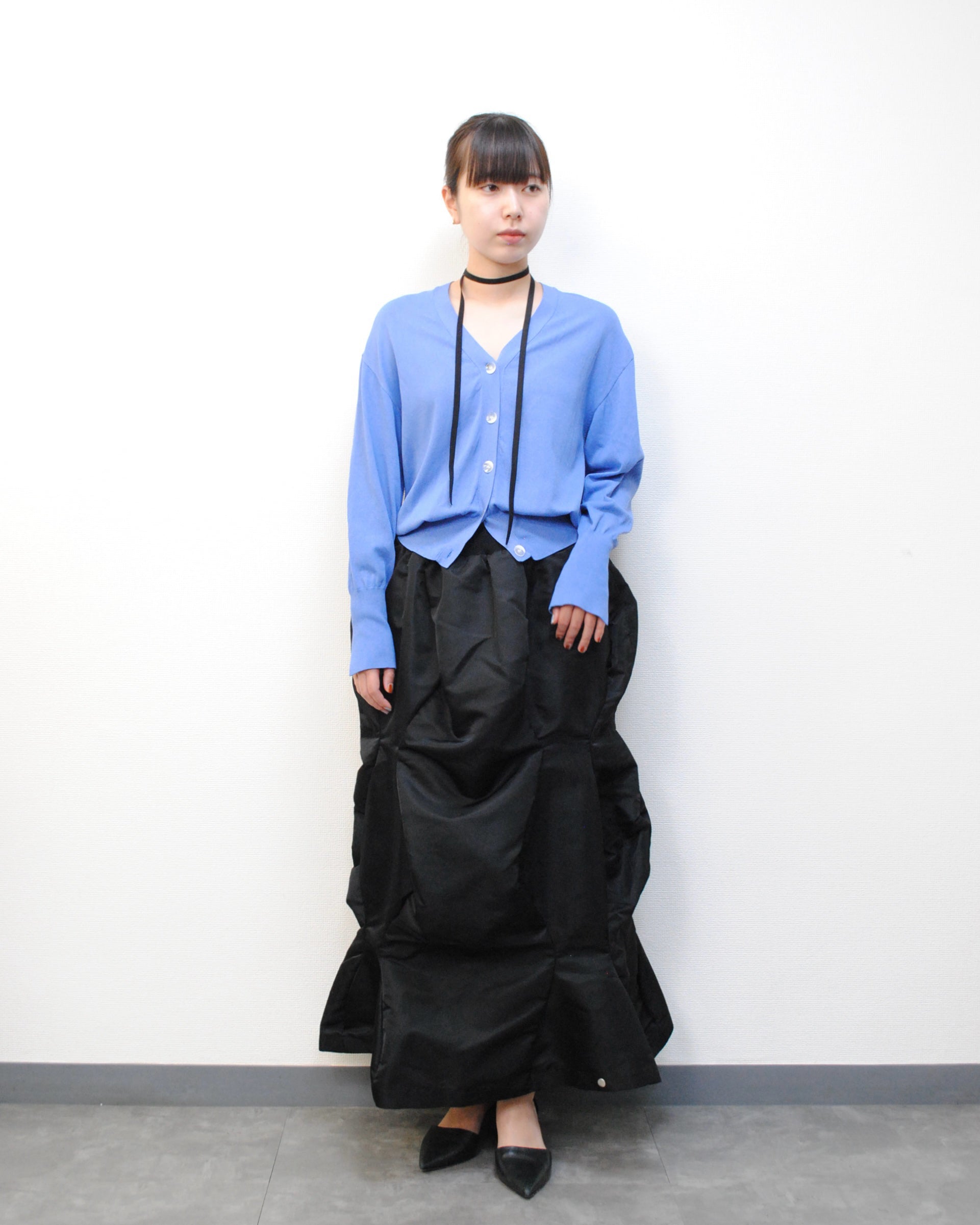 高密度撥水加工のナイロンツイルを使用したロングスカート。ウエストは編み立てリブを使用。360度ドレープが 楽しめる、曲線の立体感が特徴。 ポケット付き。内側の4つのボタンをとめると半分の⻑さの ショート丈スカートに。タイツやブーツと合わせるのもOK。