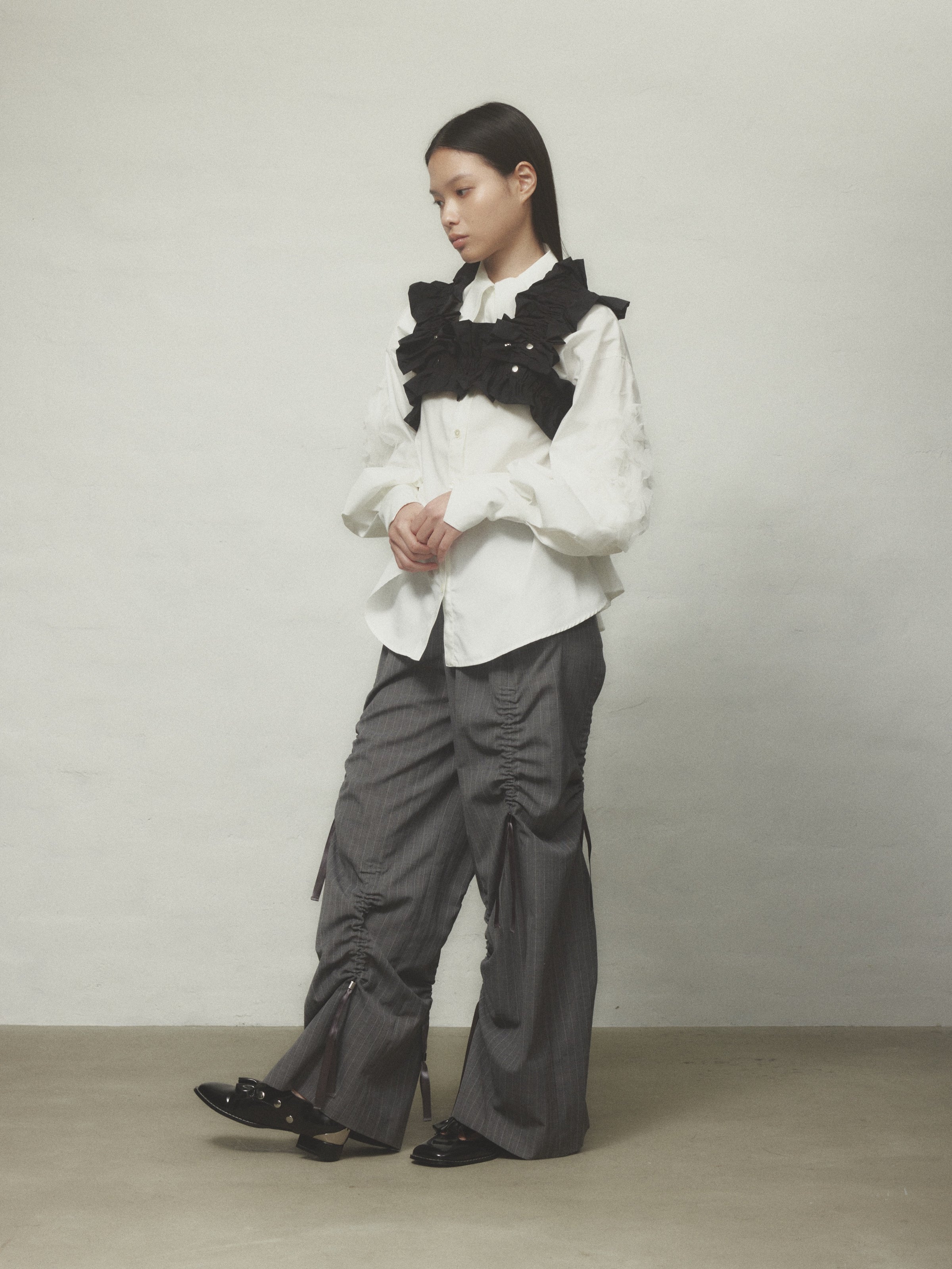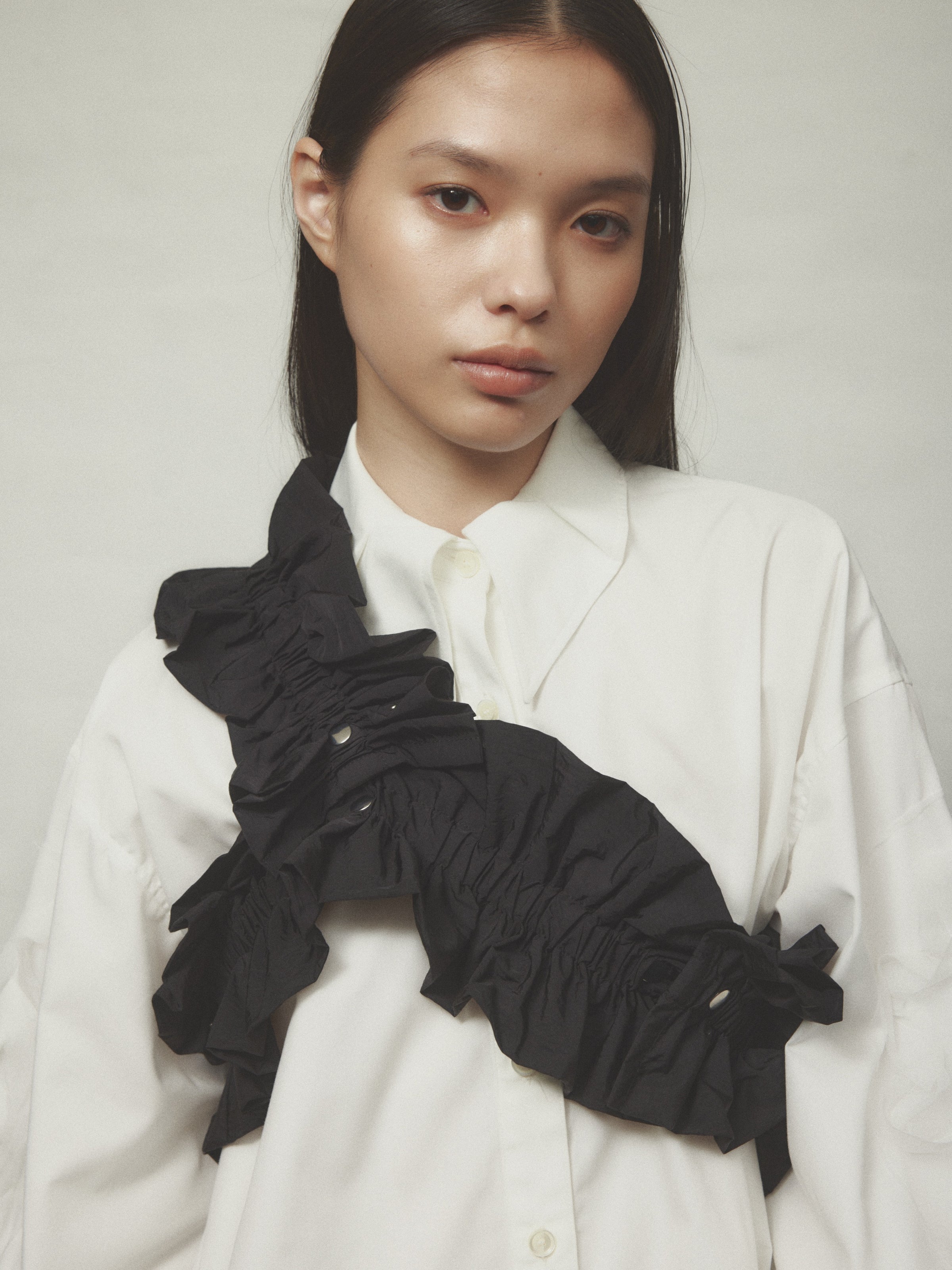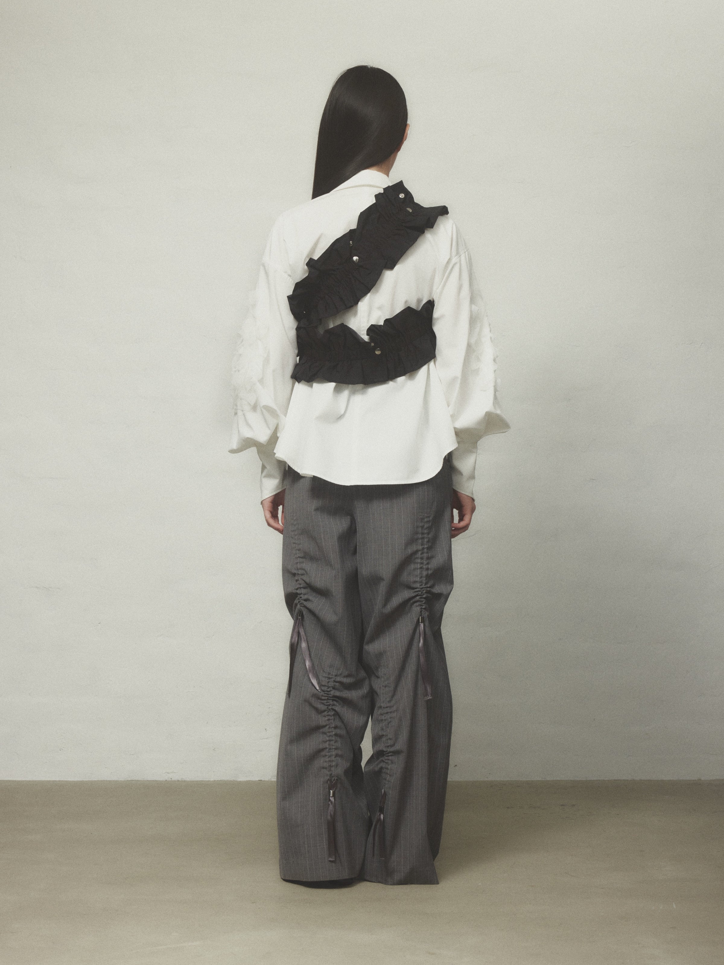 伸縮性のあるフリルで、ハーネスやウエストベルトとしてはもちろん、自由にスタイリングが可能です。
