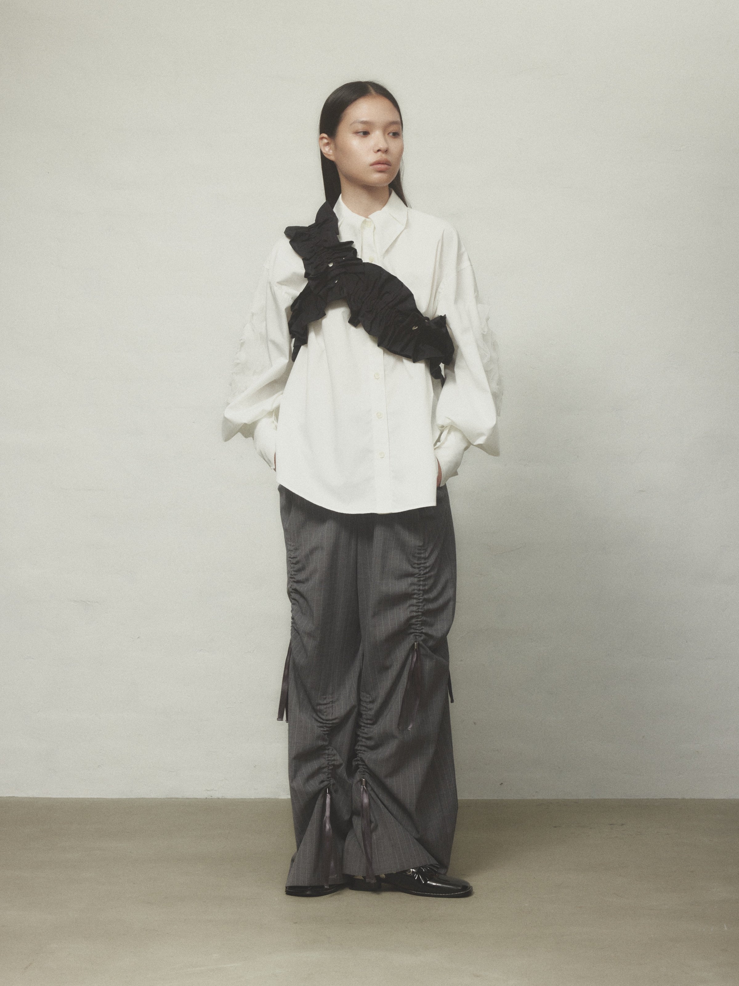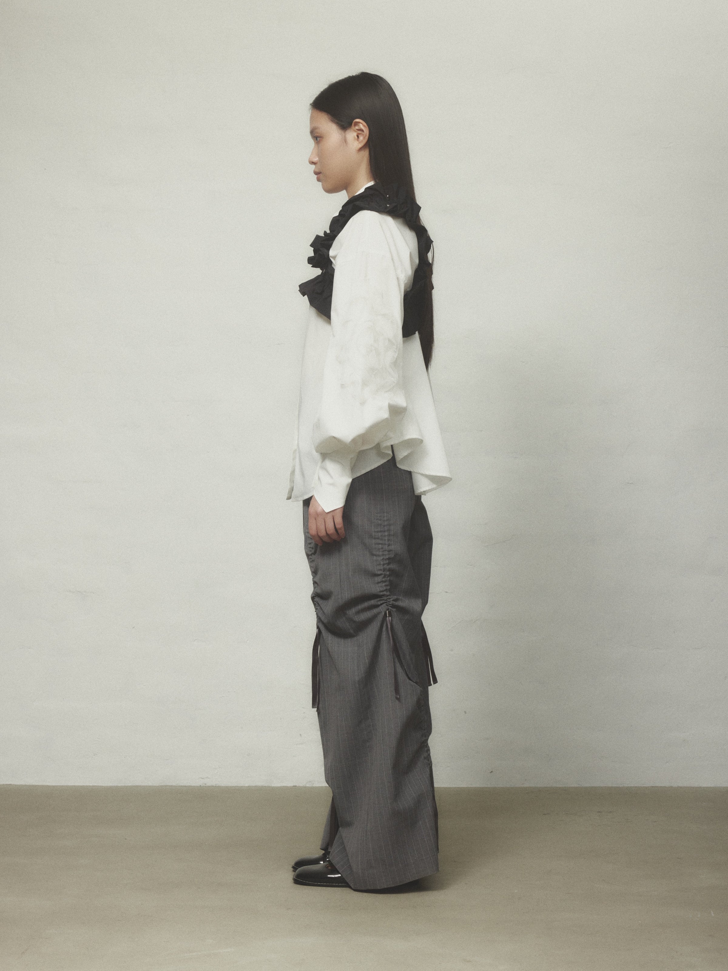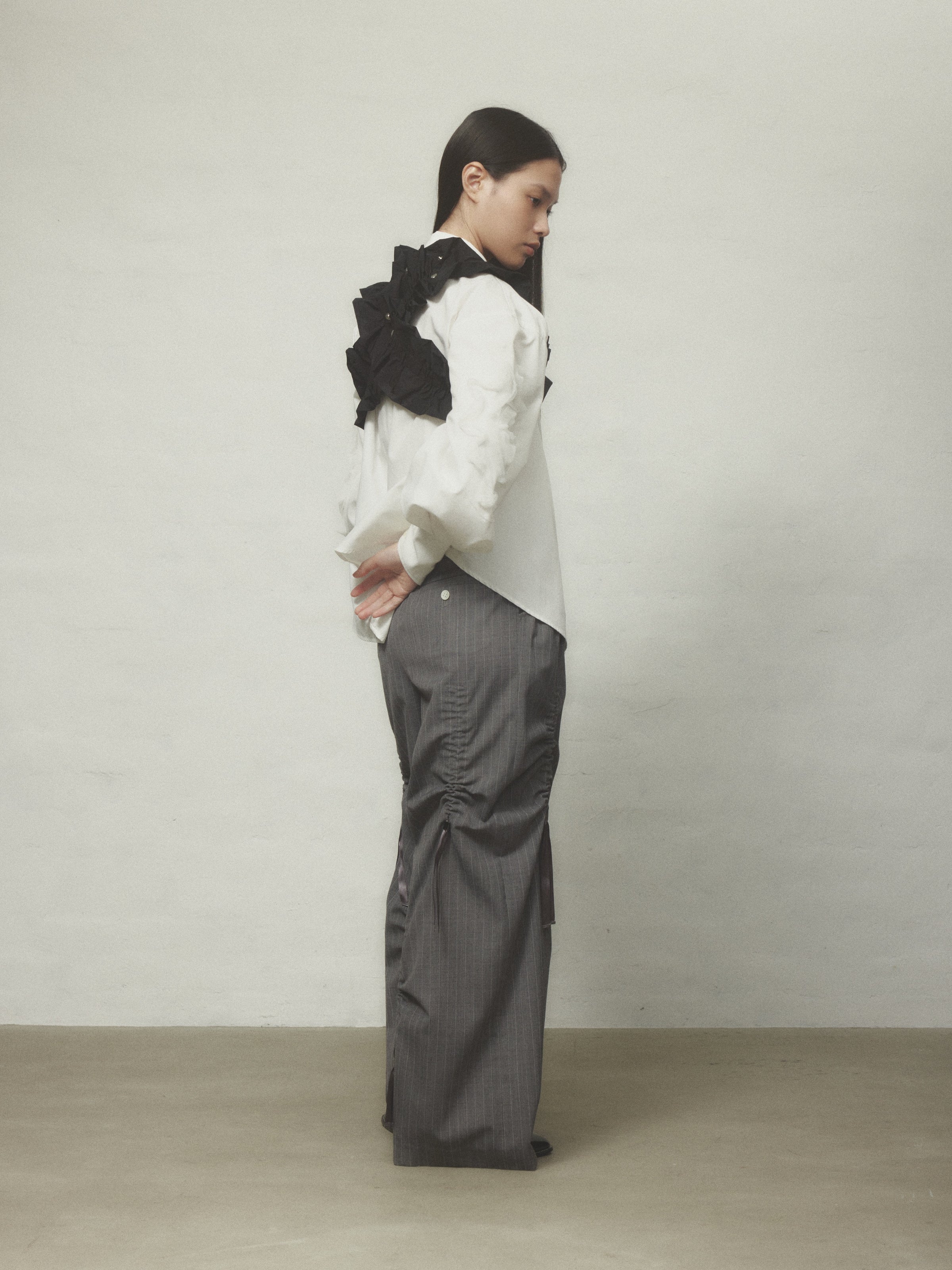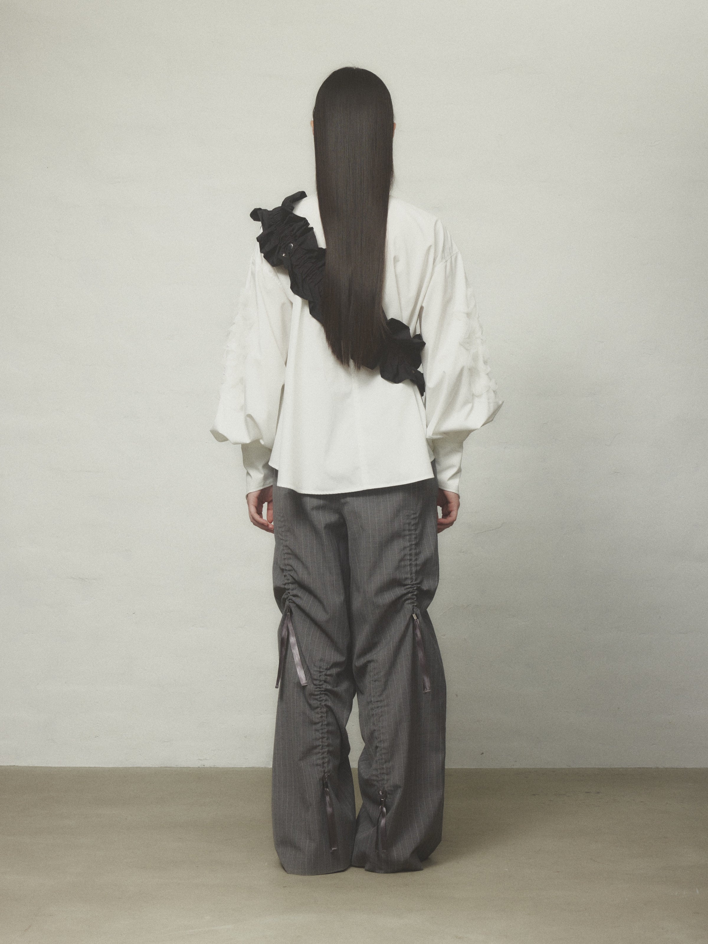 伸縮性のあるフリルで、ハーネスやウエストベルトとしてはもちろん、自由にスタイリングが可能です。