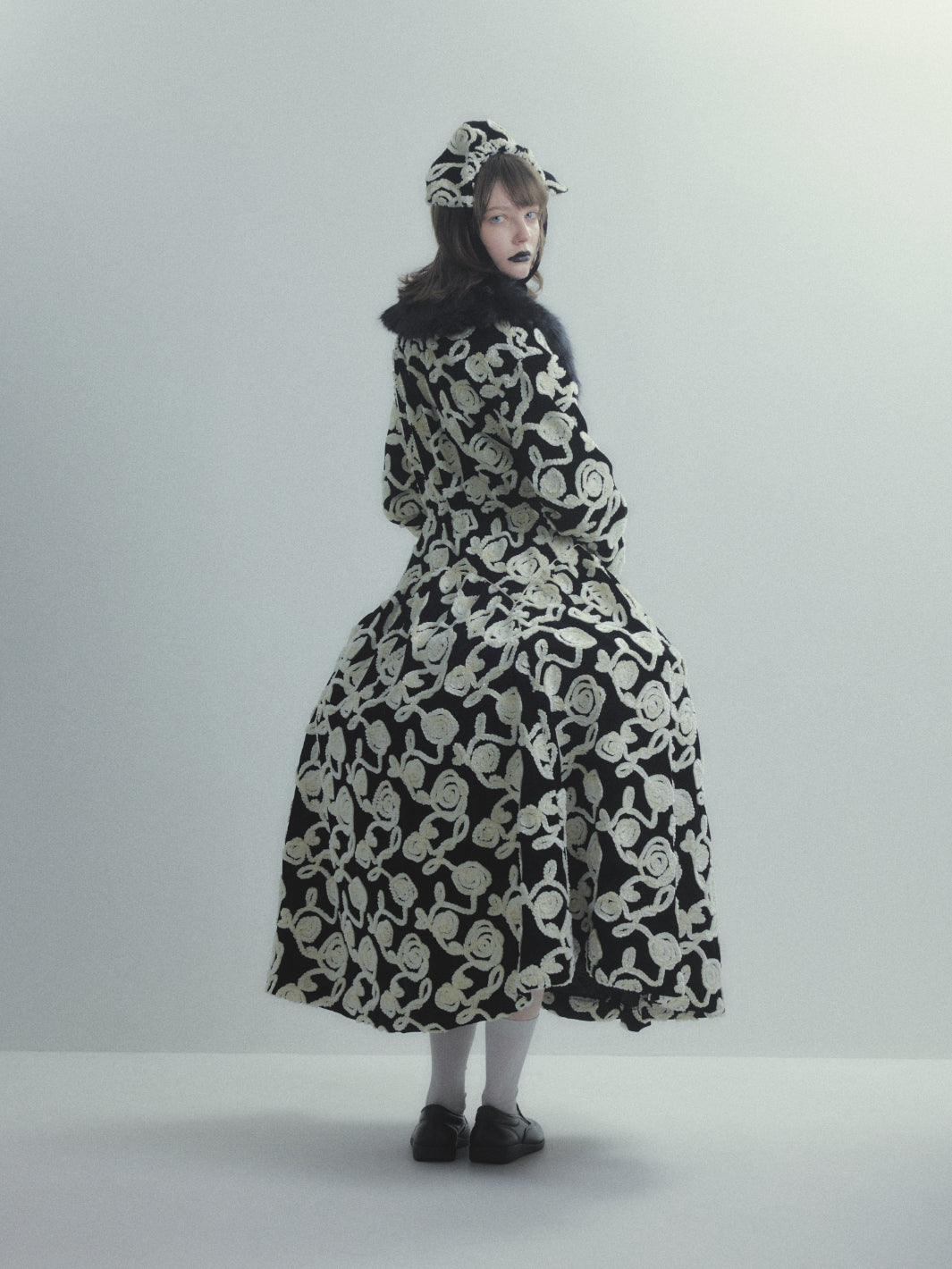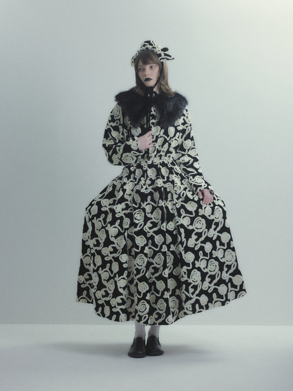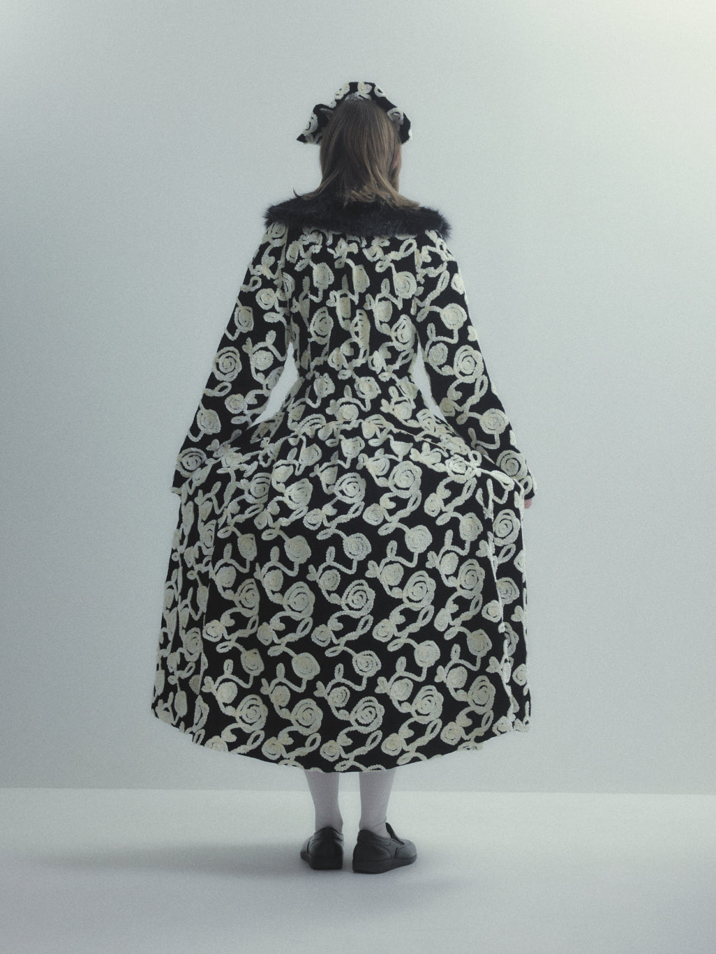 薔薇柄刺繍のベルベットを贅沢に使用した長袖ハイネックドレス。被るだけで着用できるリラックス感のあるドレス。
