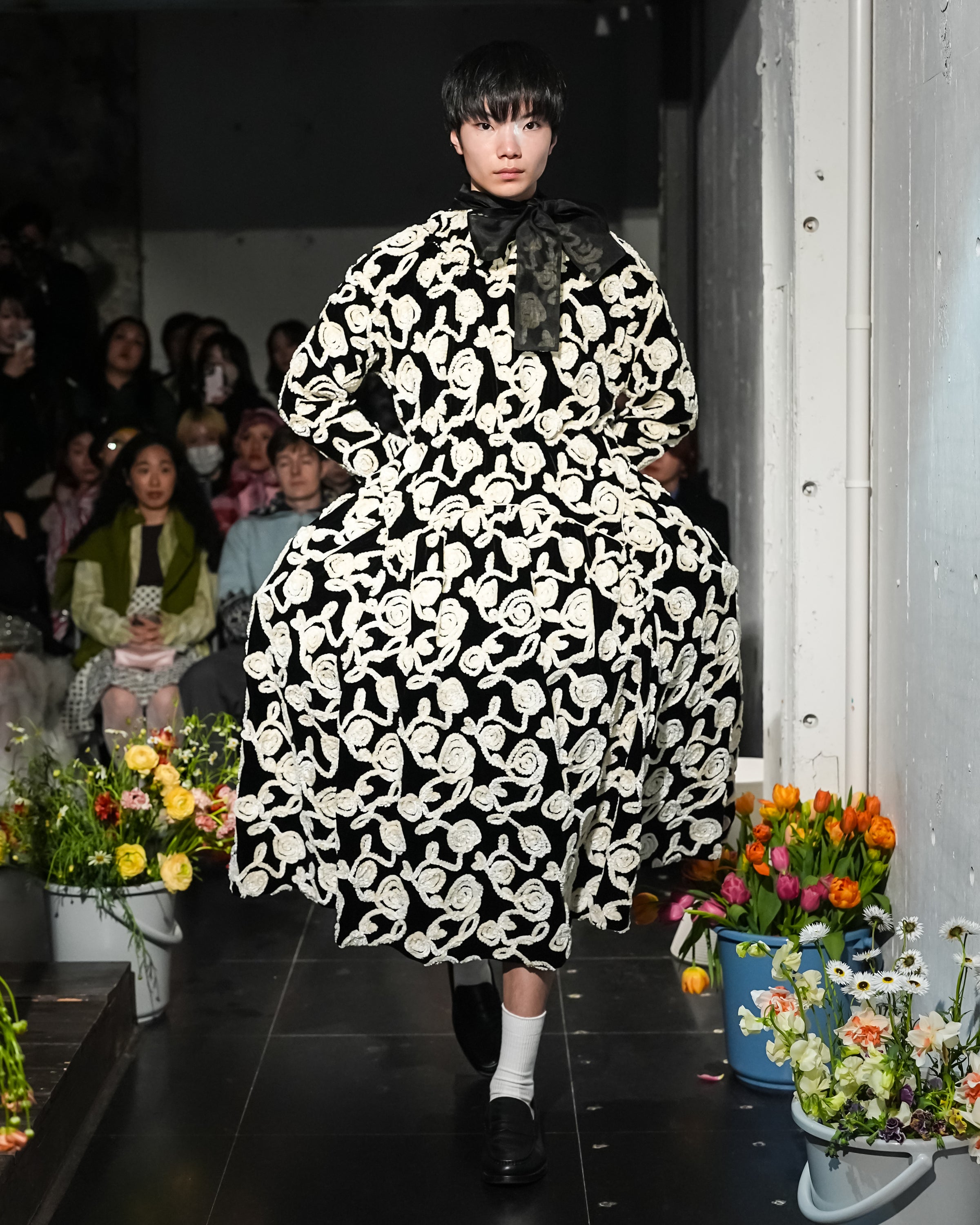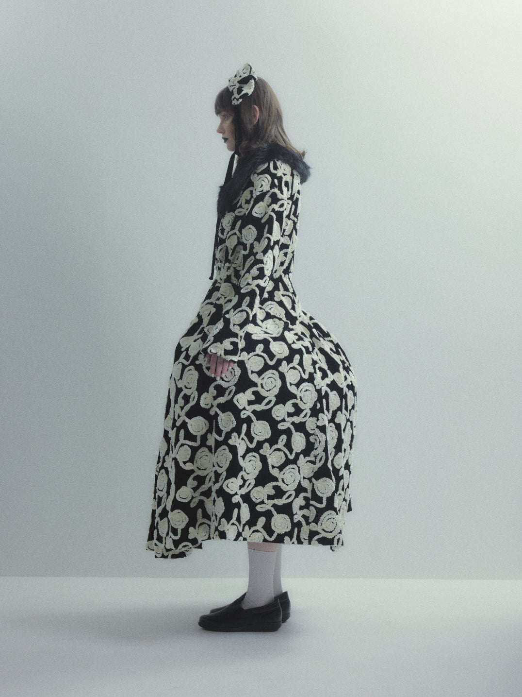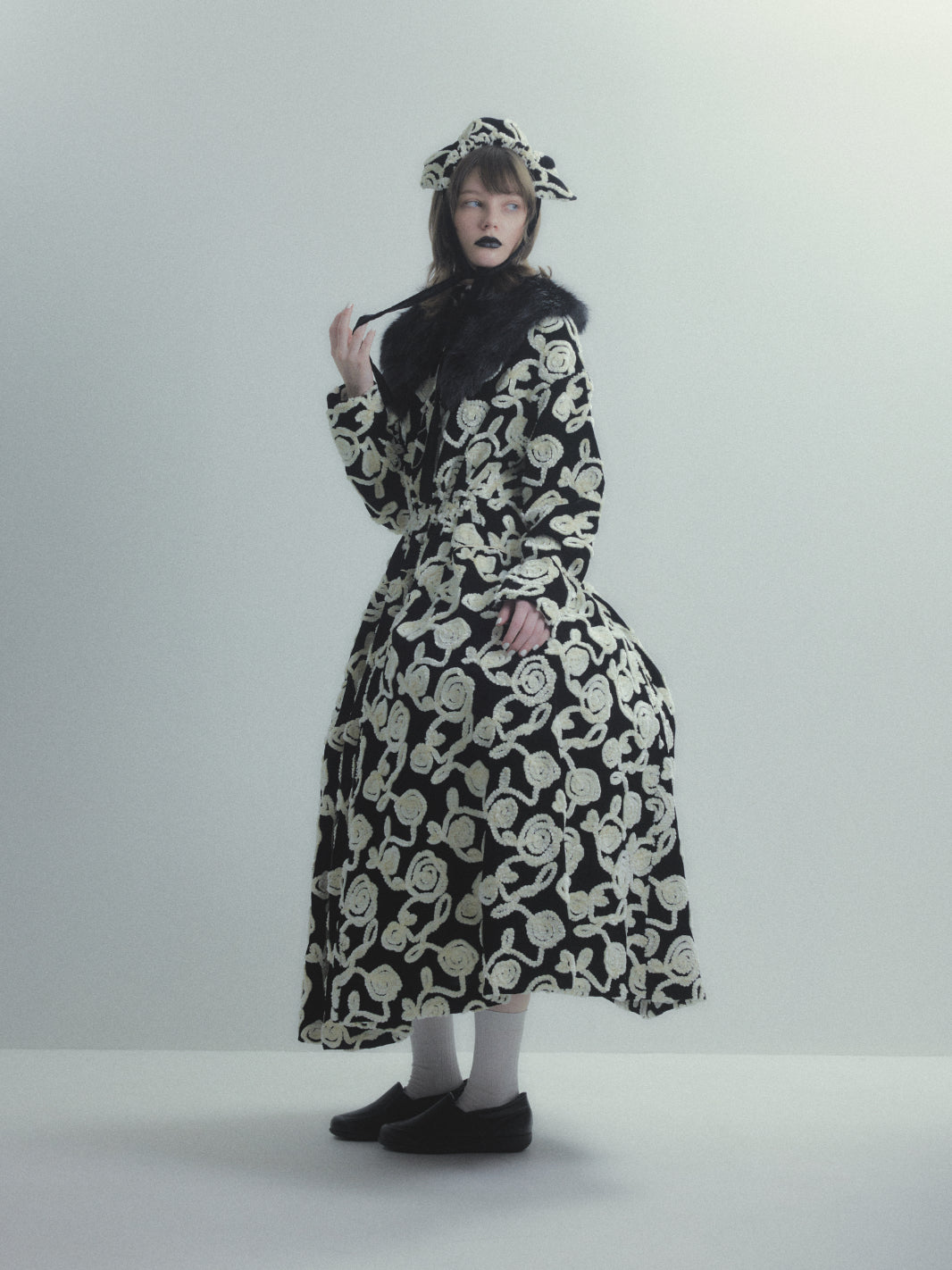 薔薇柄刺繍のベルベットを贅沢に使用した長袖ハイネックドレス。被るだけで着用できるリラックス感のあるドレス。