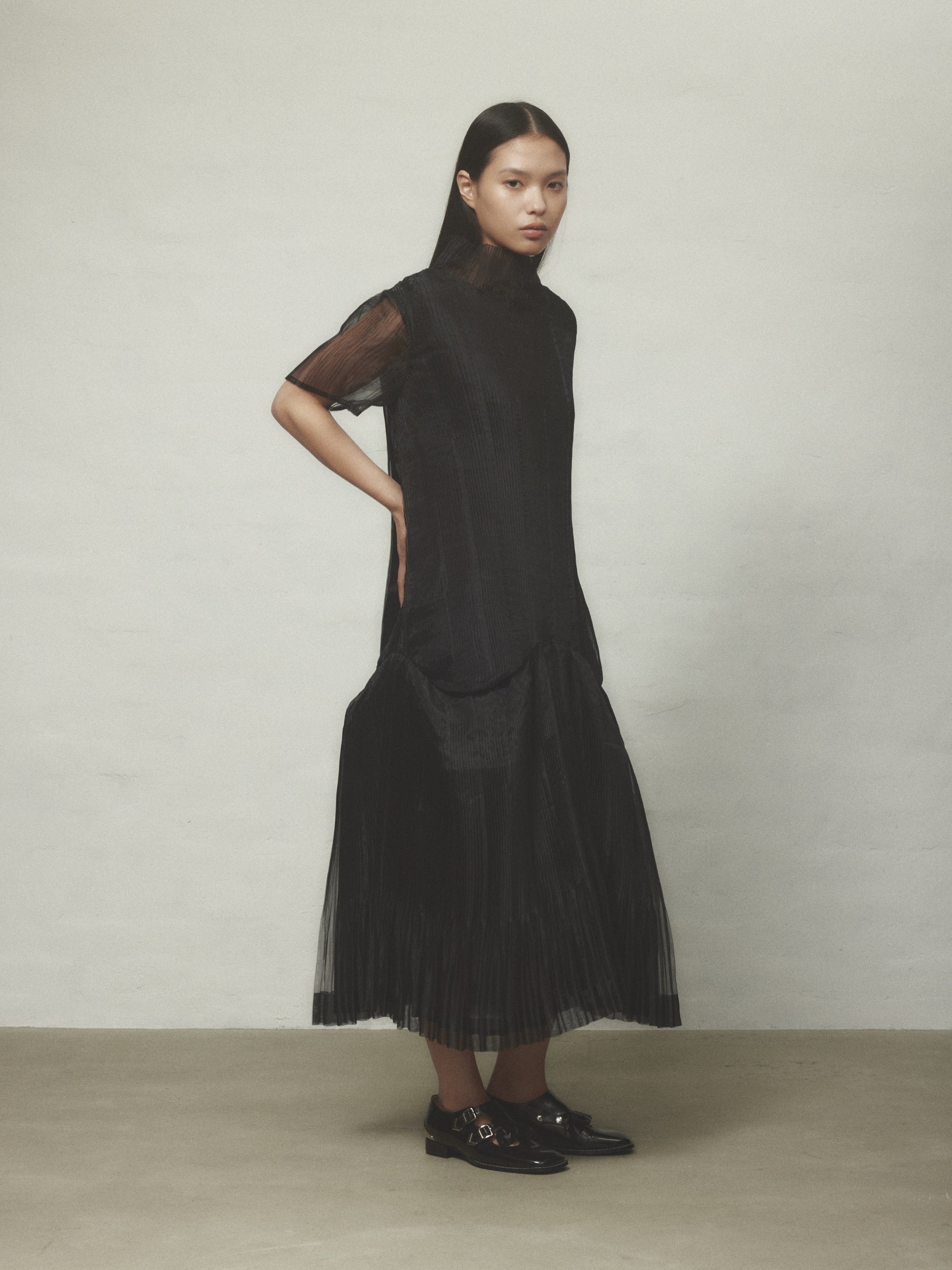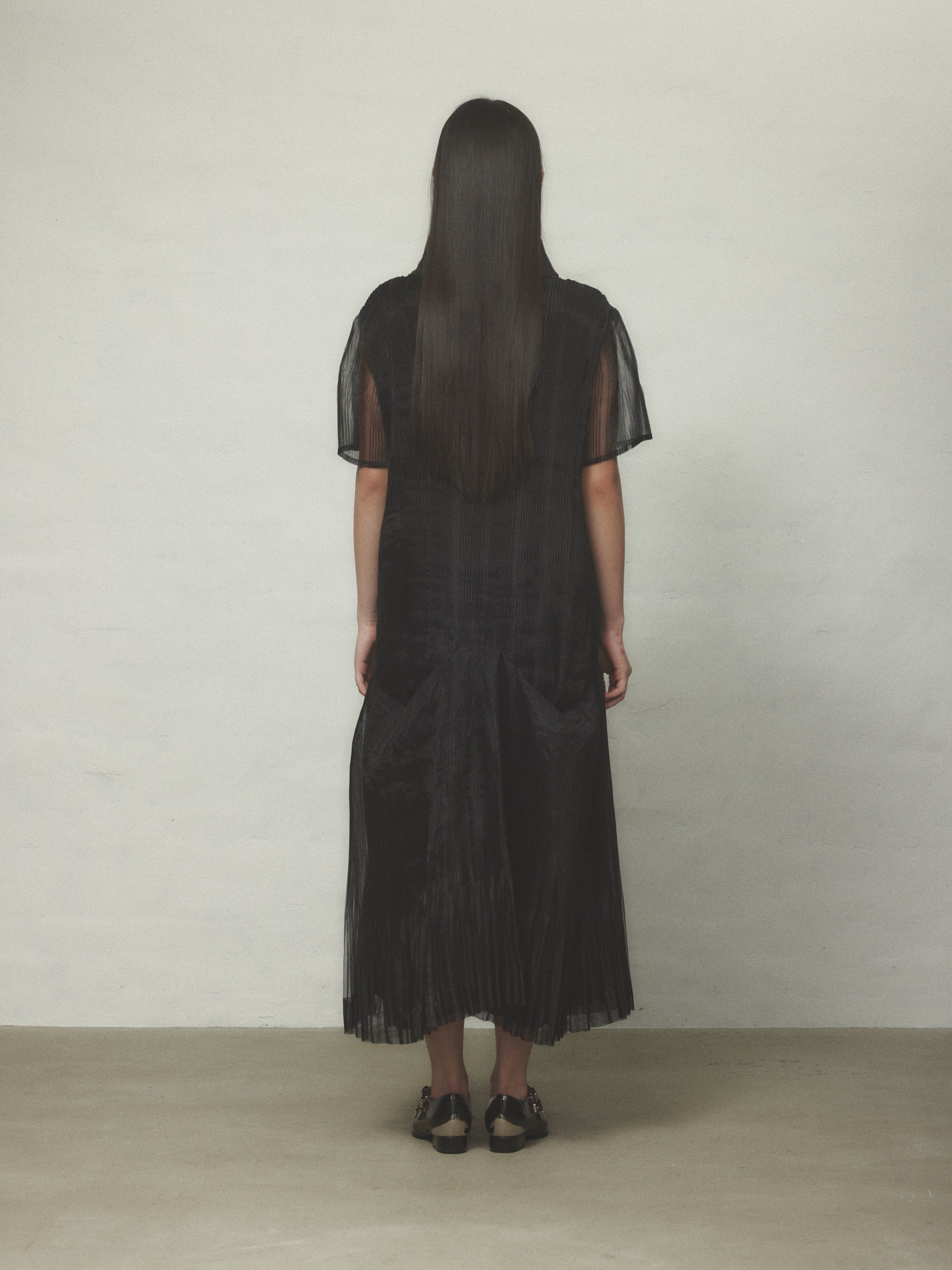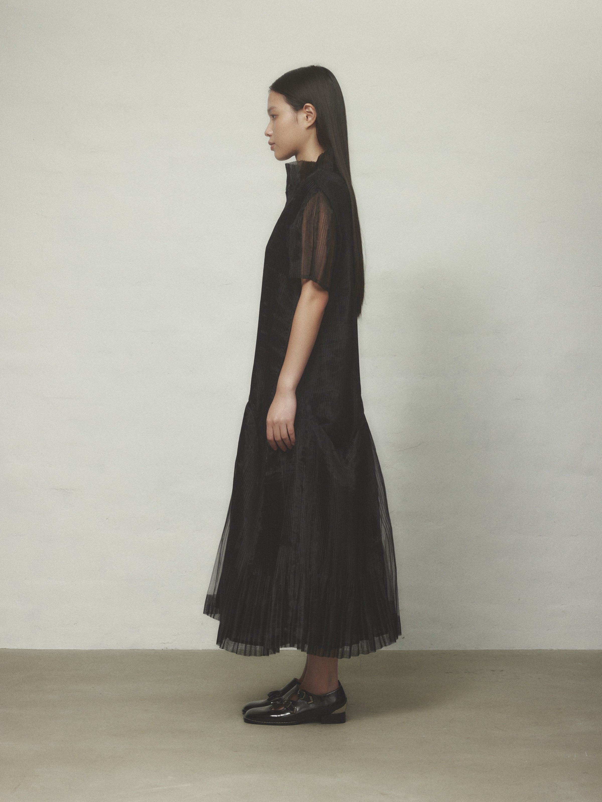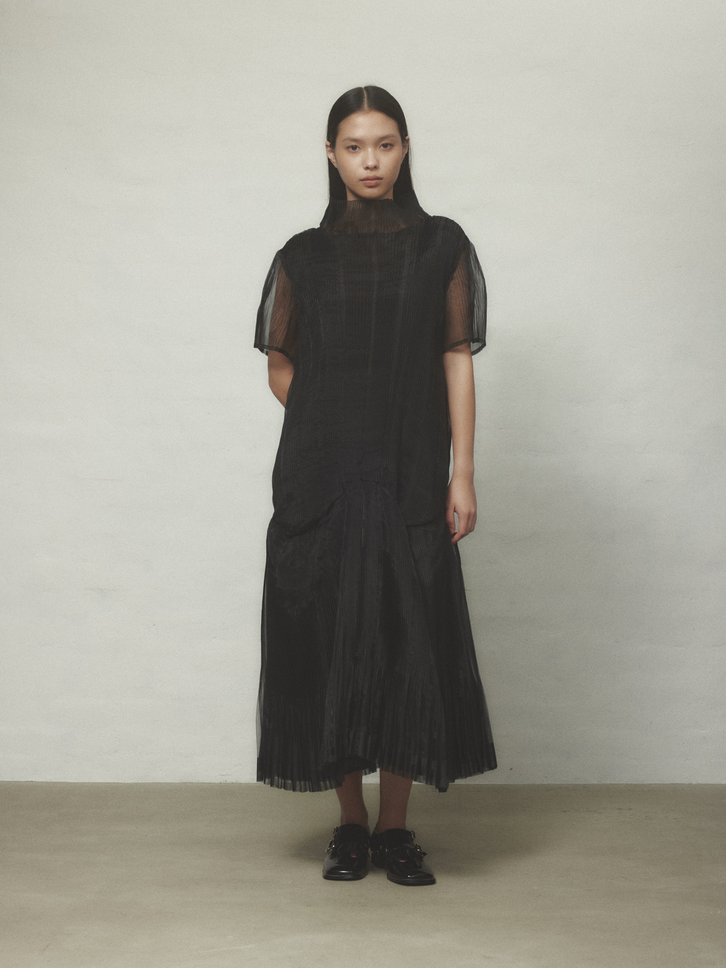 オーガンジーのハリとコシ、熱可塑性を生かしてHOUGAらしい立体的なプリーツのアイテムに仕上げました。