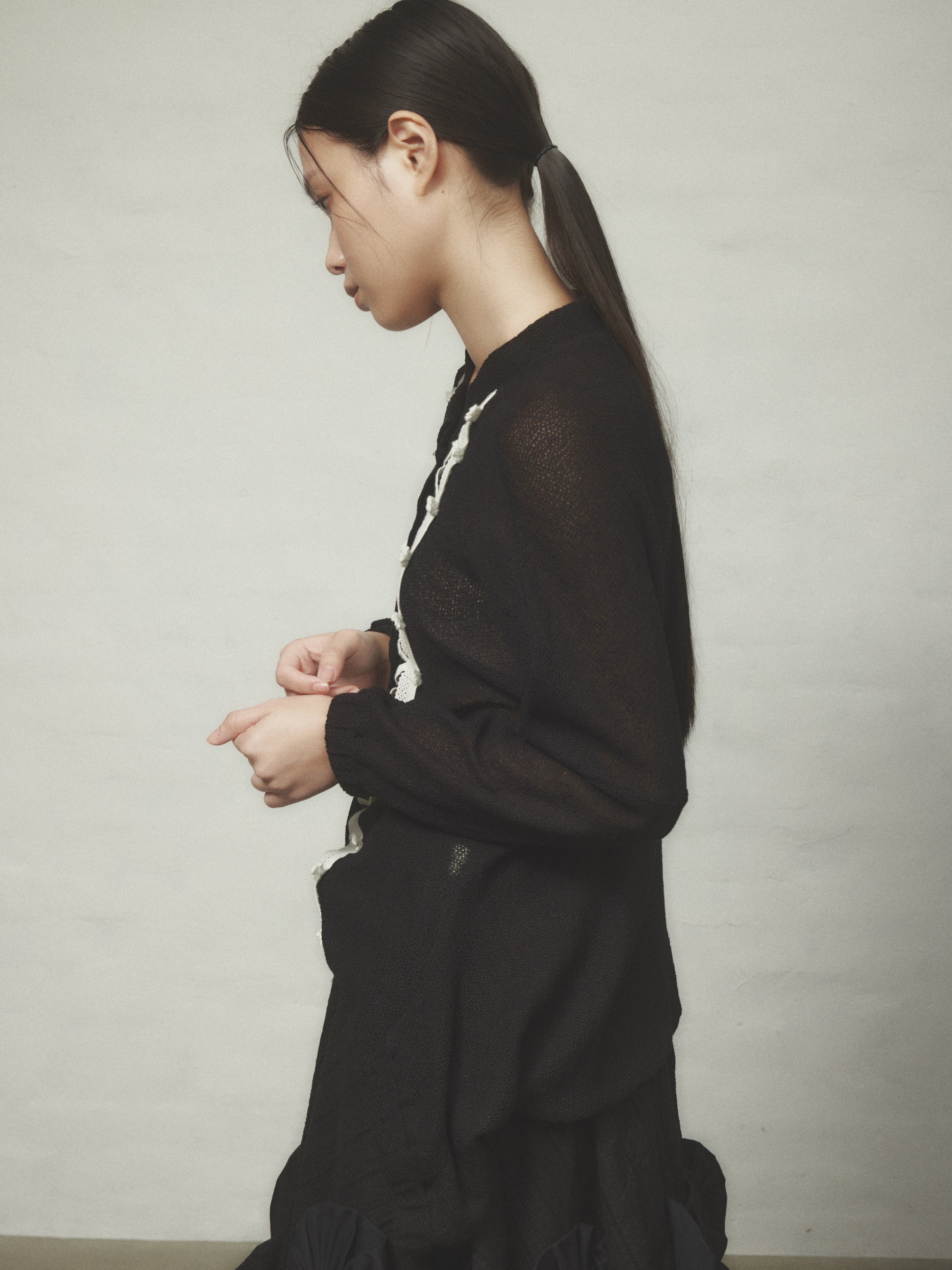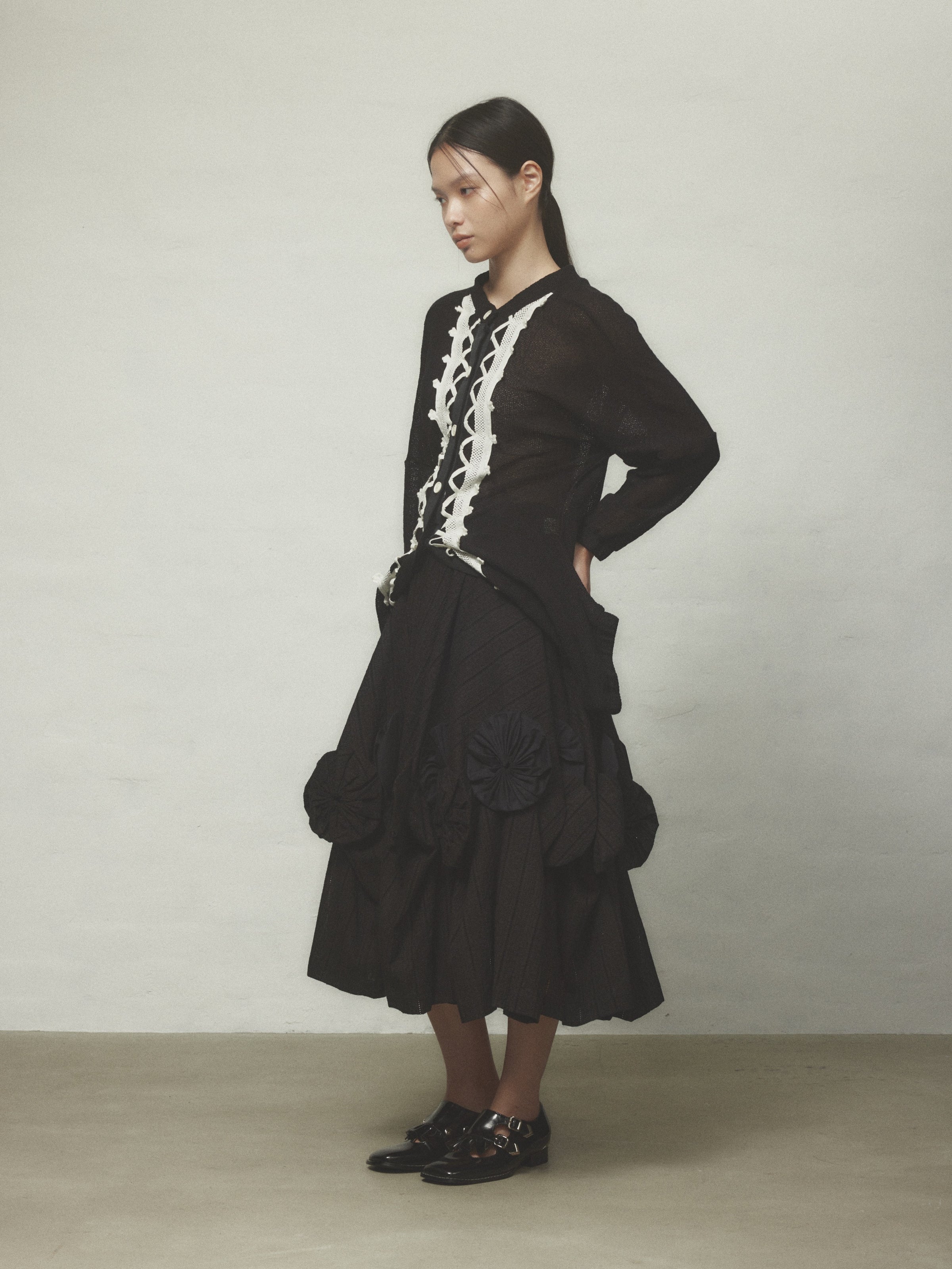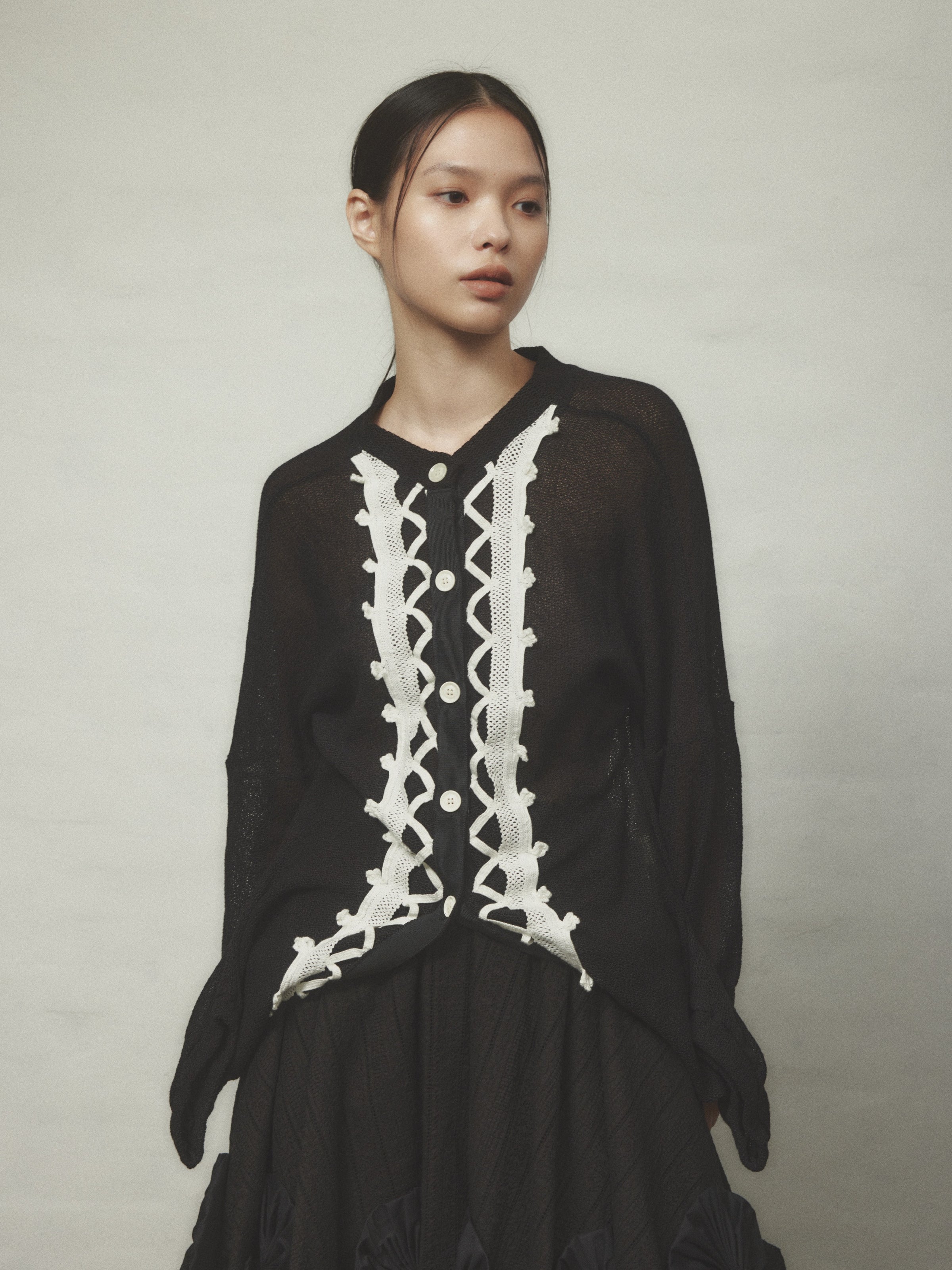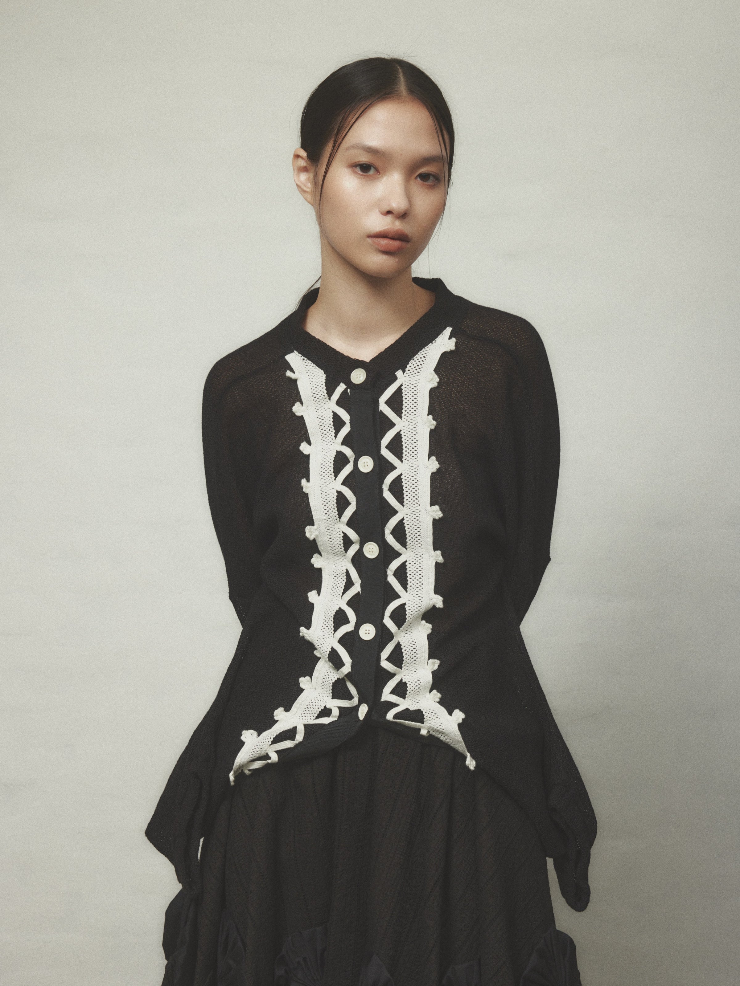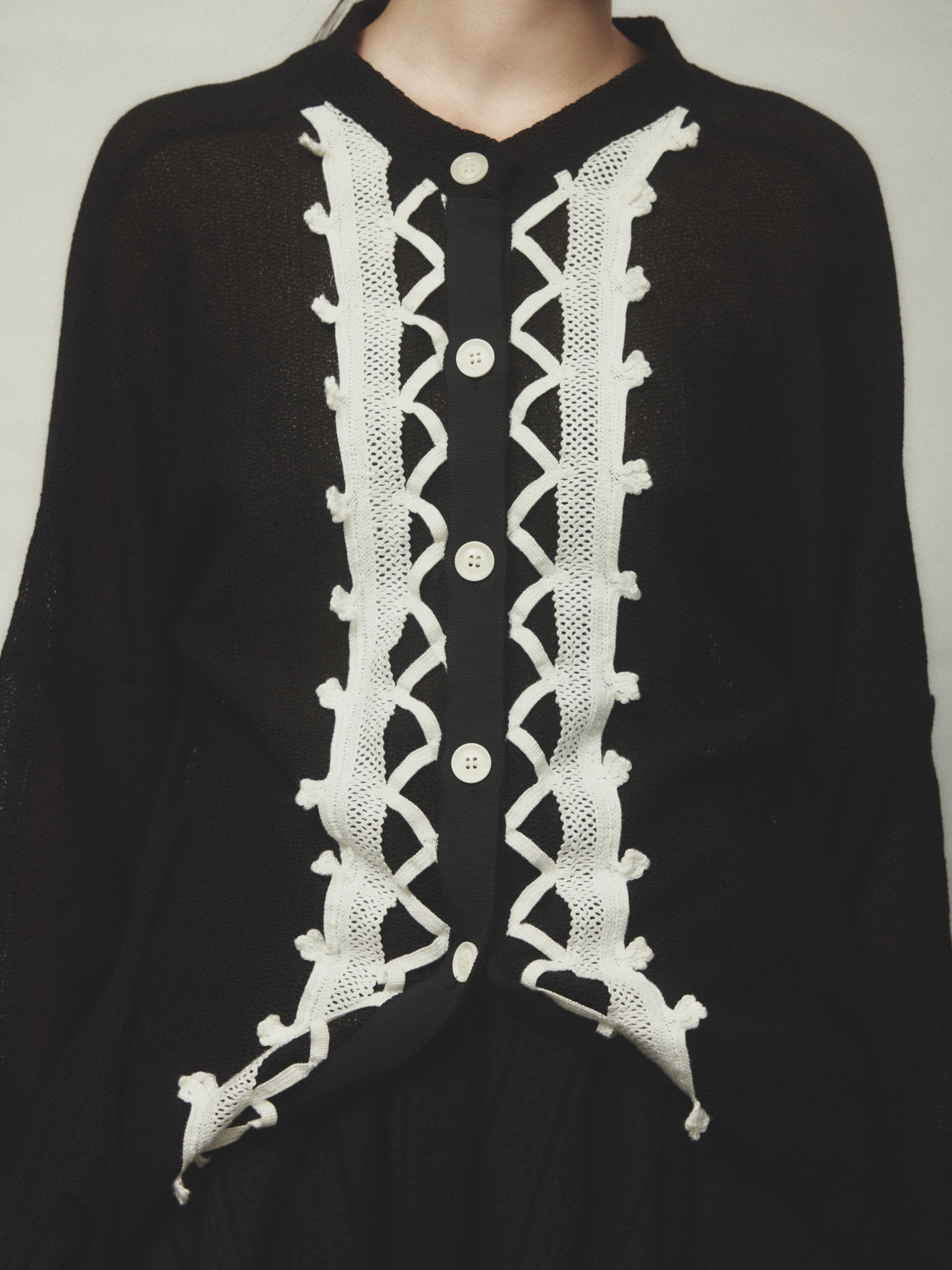 前立てにレースのテープが施された変形カーディガン。