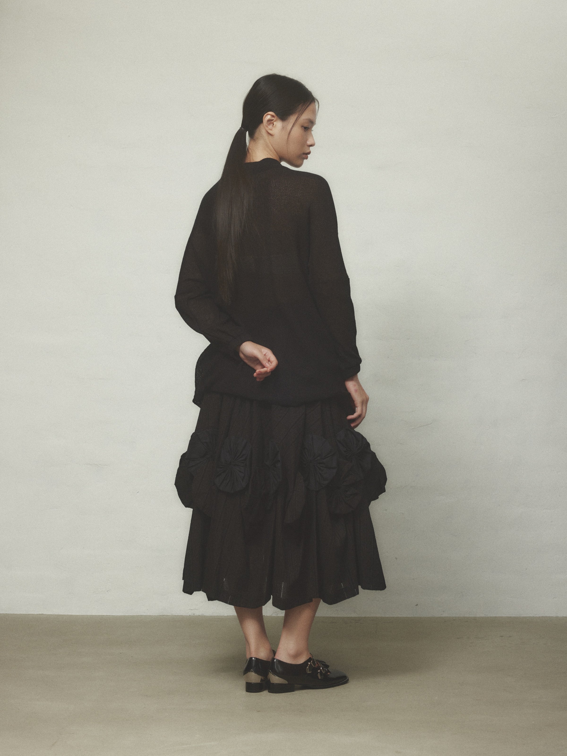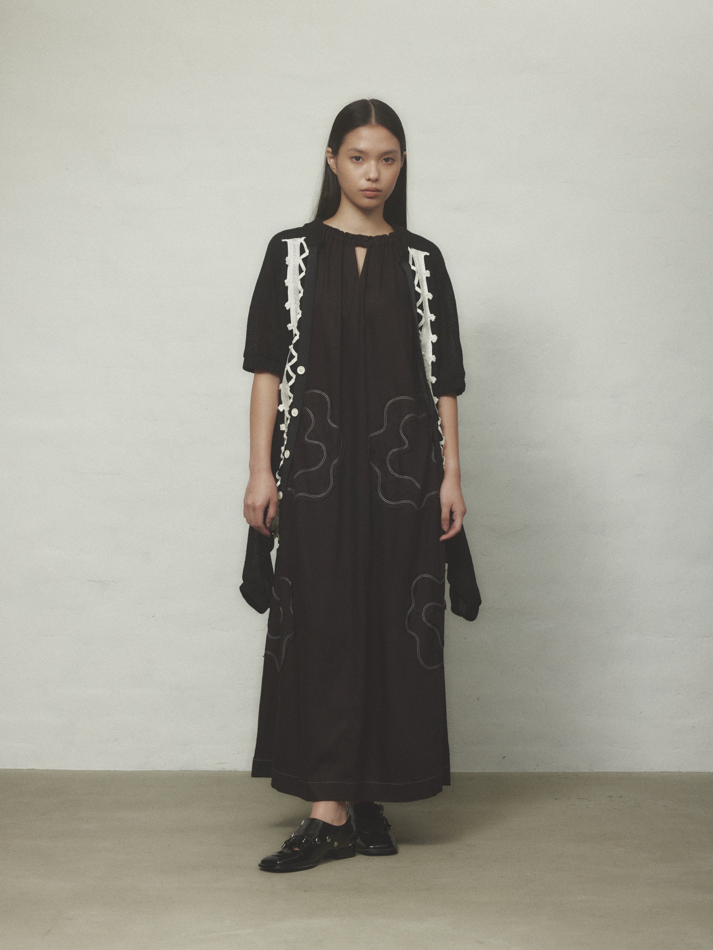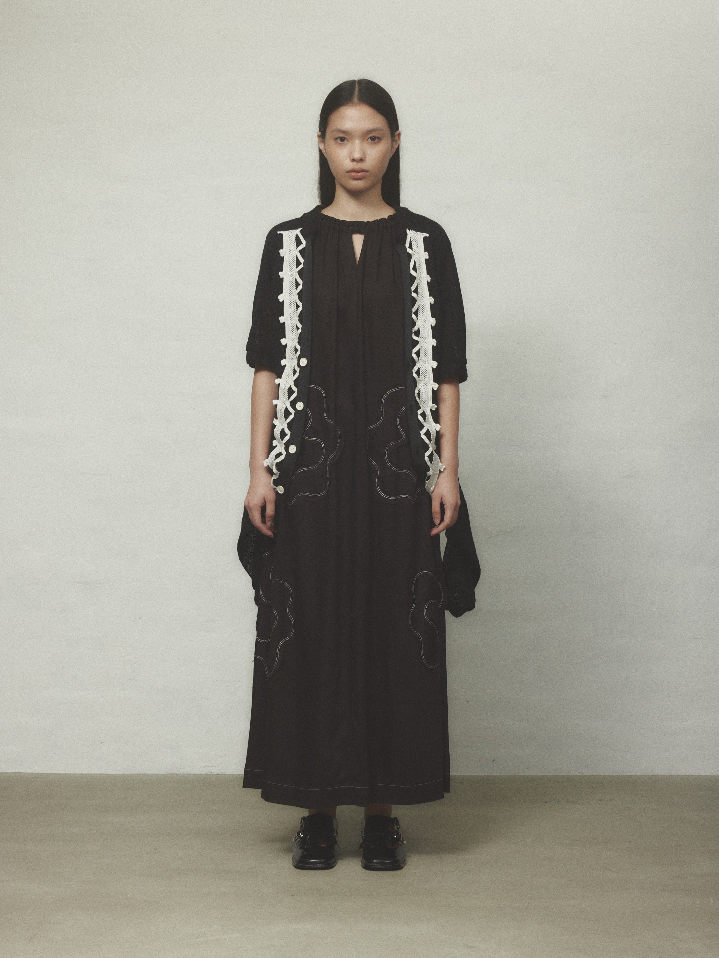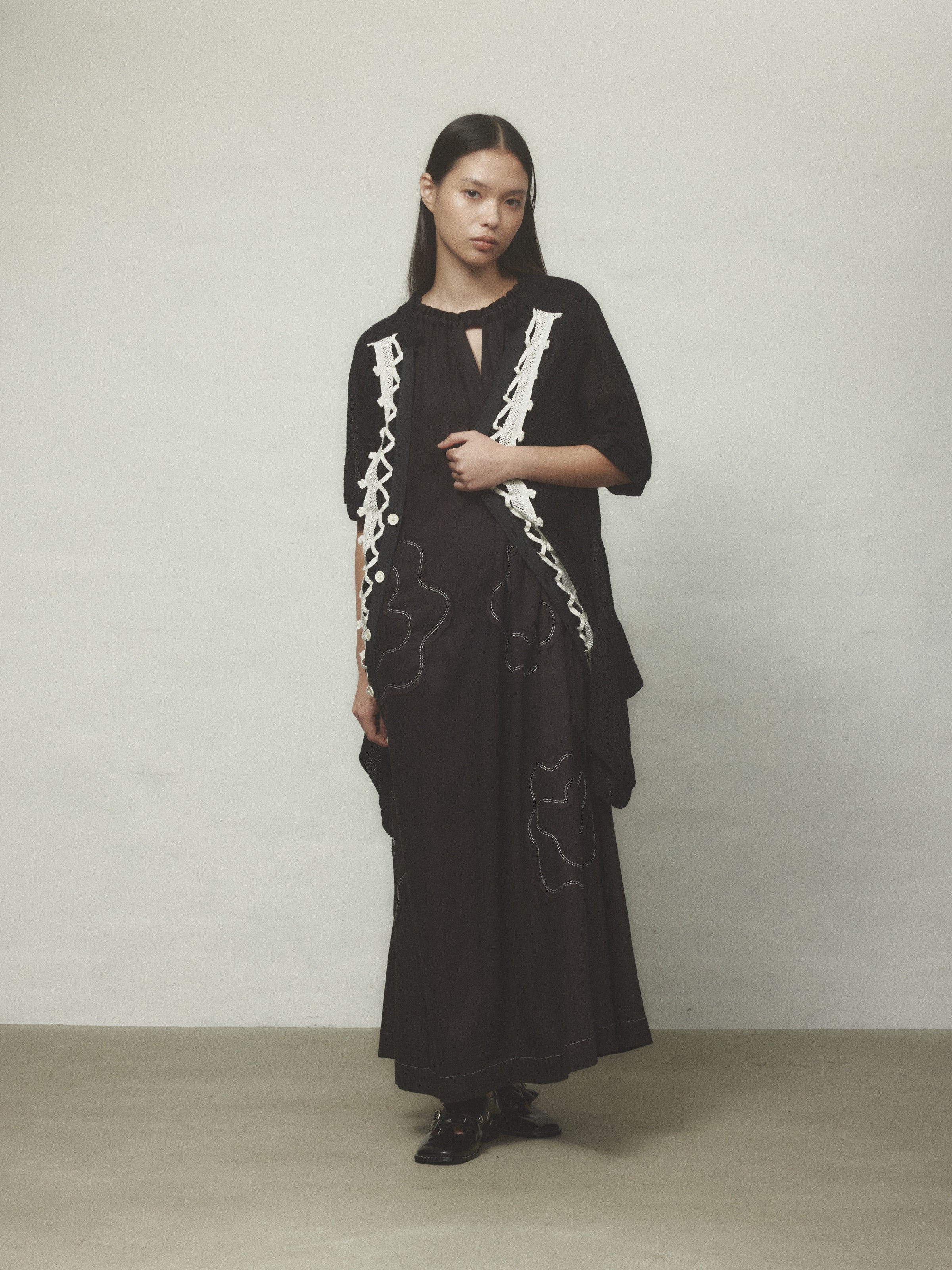 栃木県足利の伝統技術によって生まれた美しいトーションレースを大胆に使用。存在感のある水牛ボタンもポイントです。