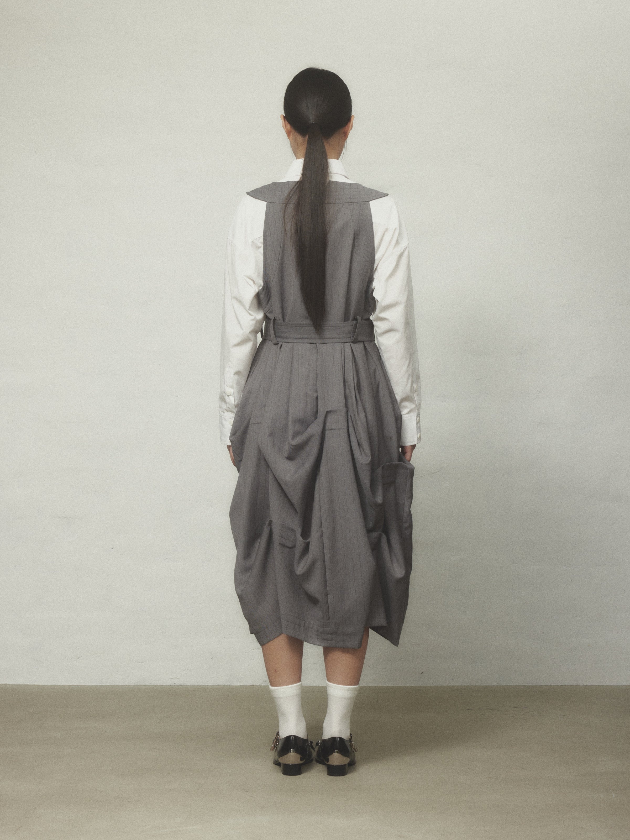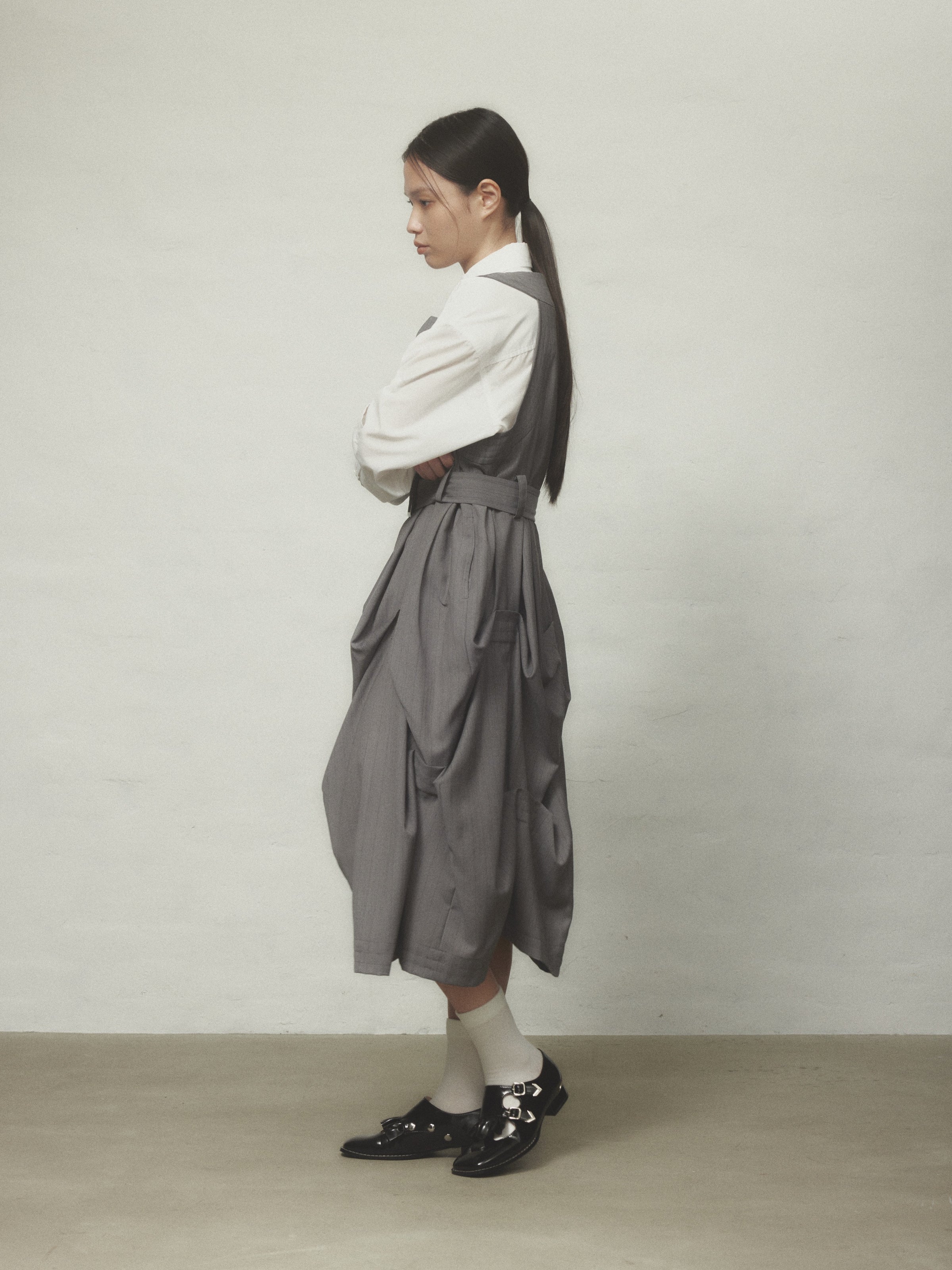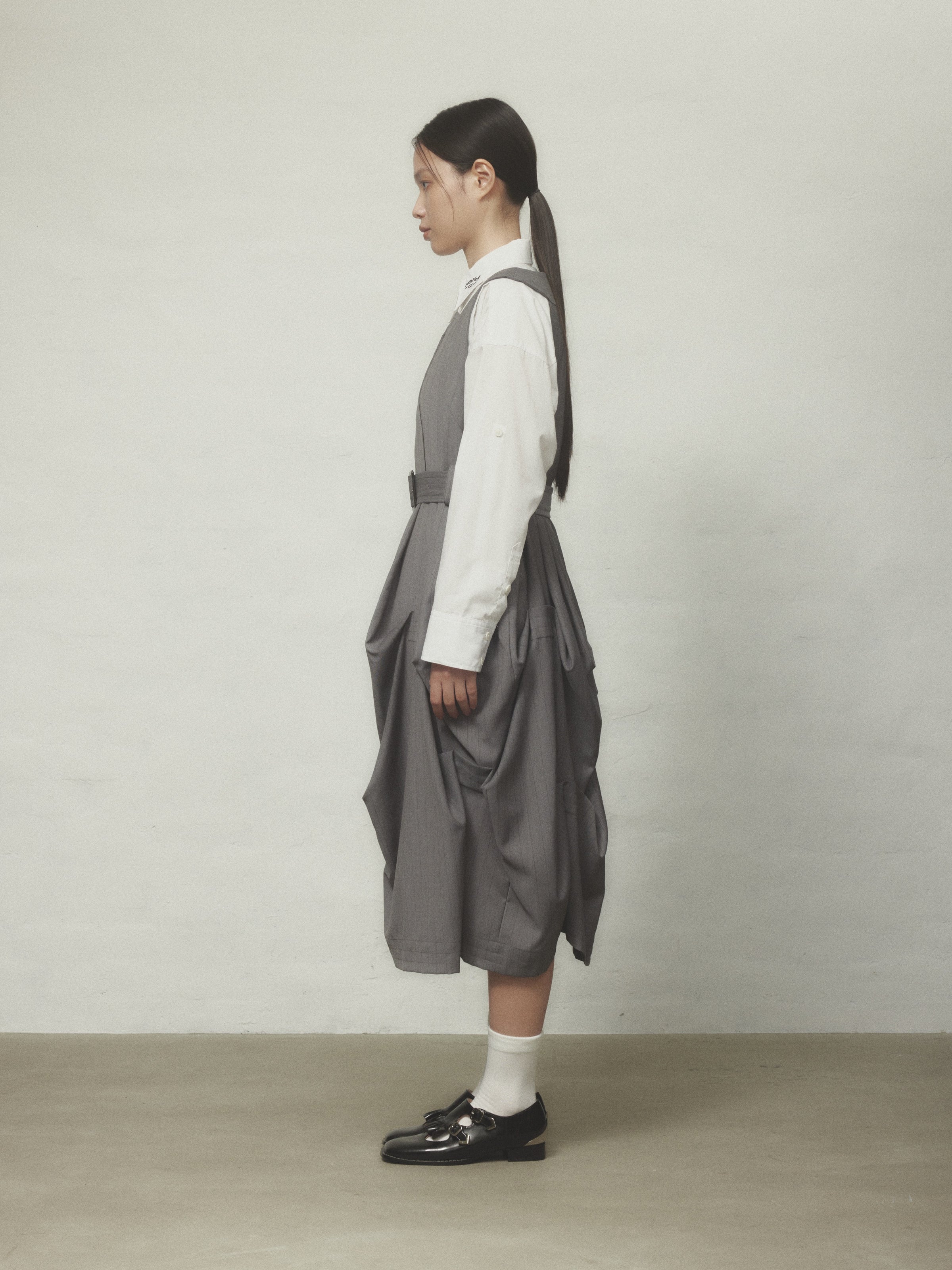 スカート部分にたっぷりとタックを入れた立体感のあるシルエットが特徴的なジャンパースカート。
