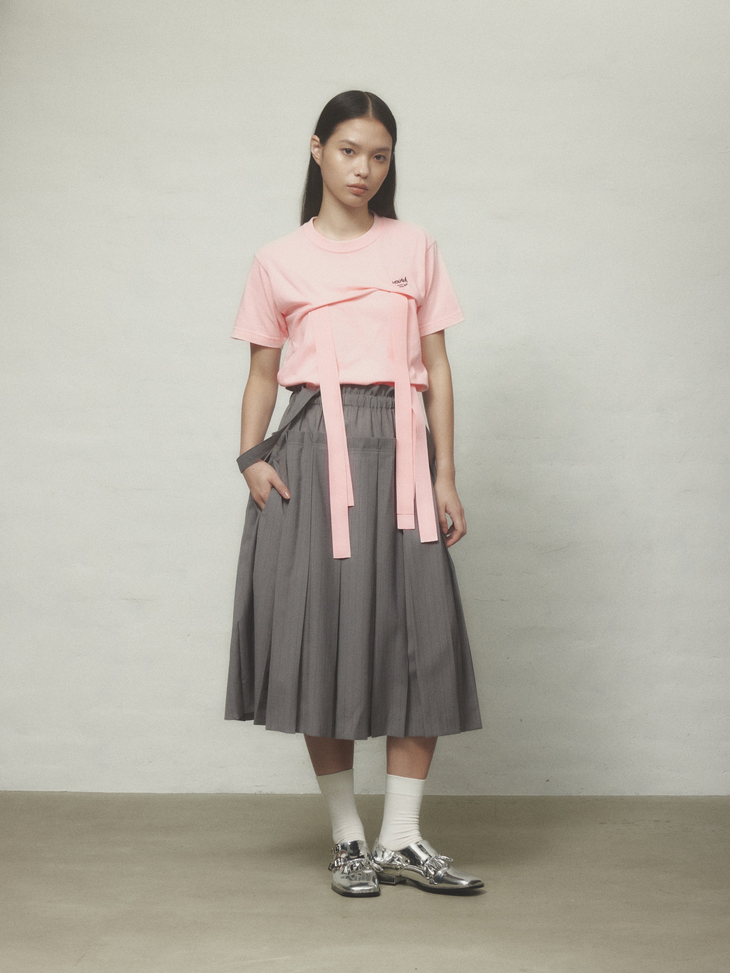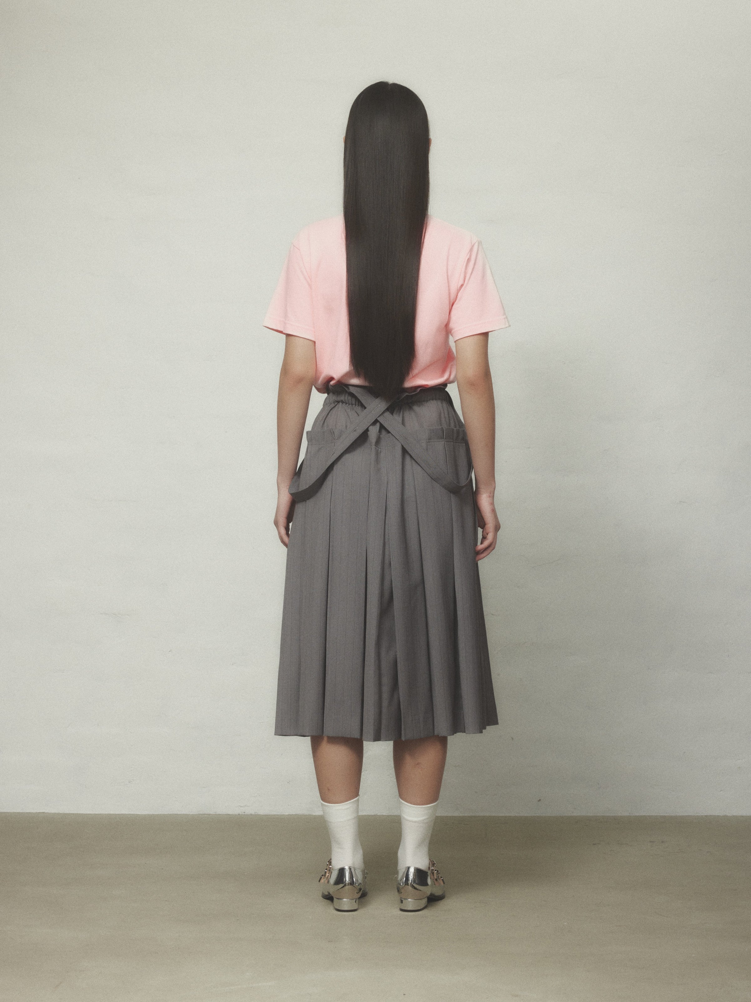 ウエスト内側にはボタン付きのストラップがあり、サスペンダースカートとしても着用可能。