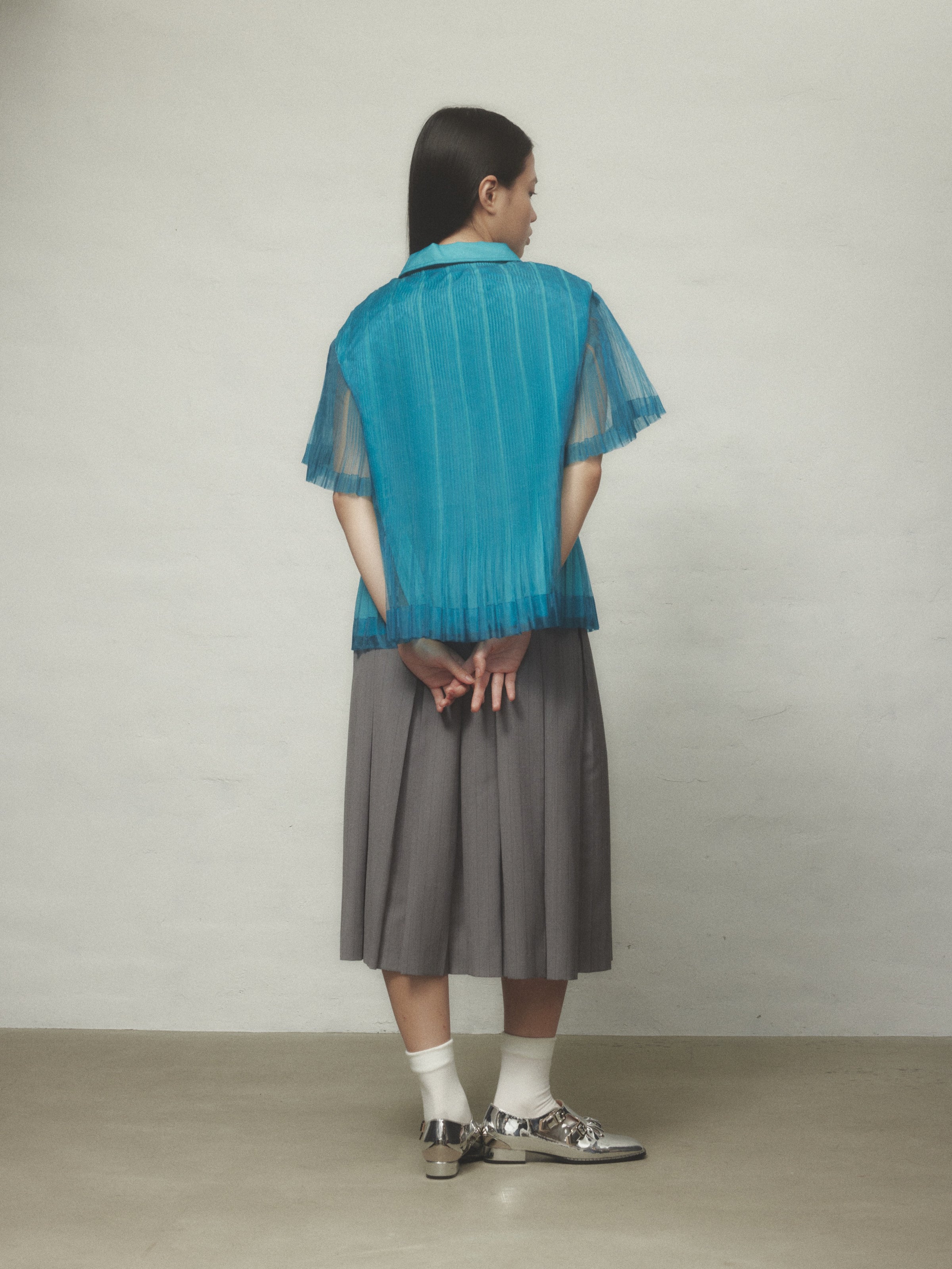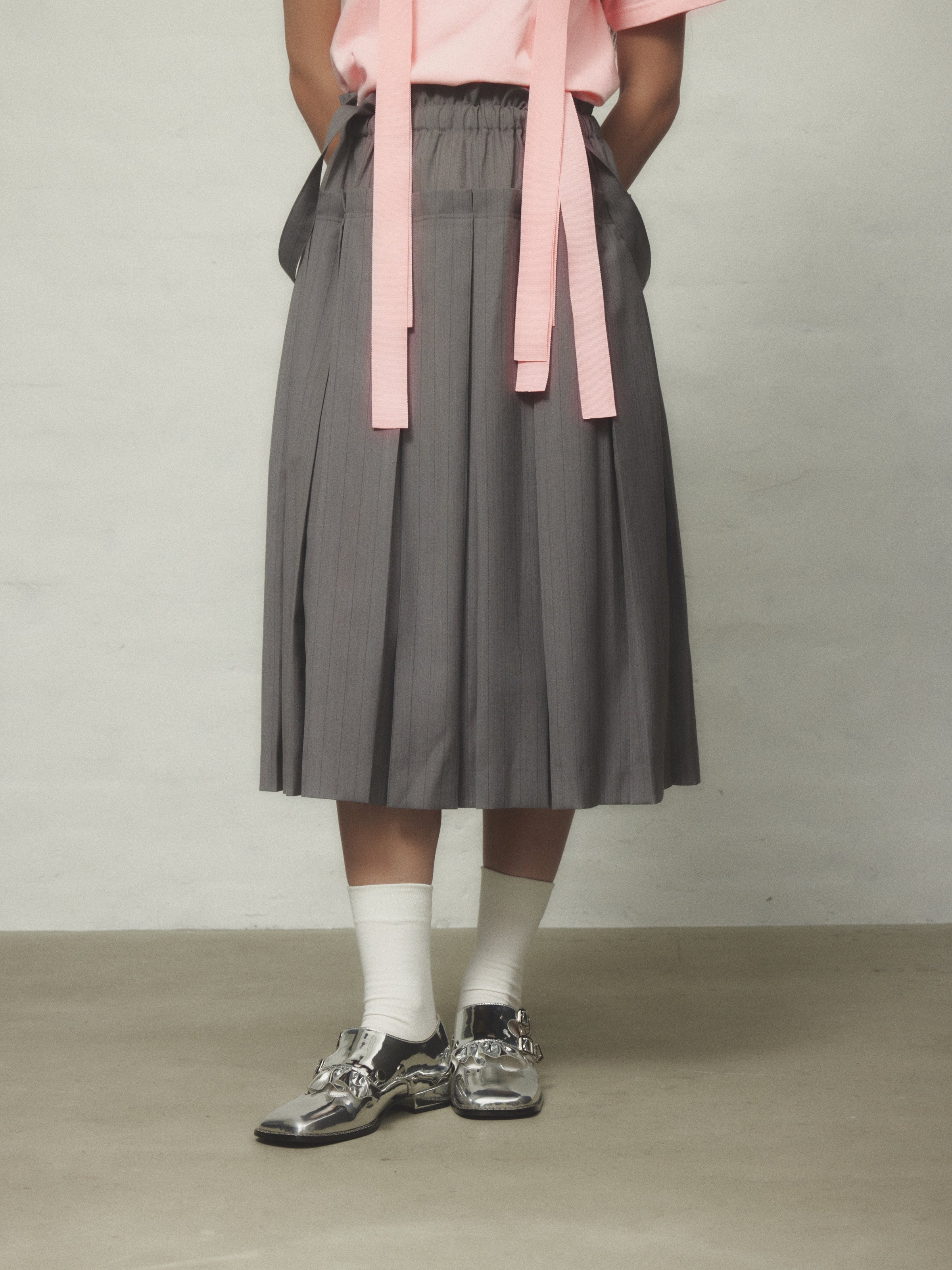 突き合わせのひだ山が特徴的な、インバーテッドプリーツがトラディショナルな印象を与えるプリーツスカート。