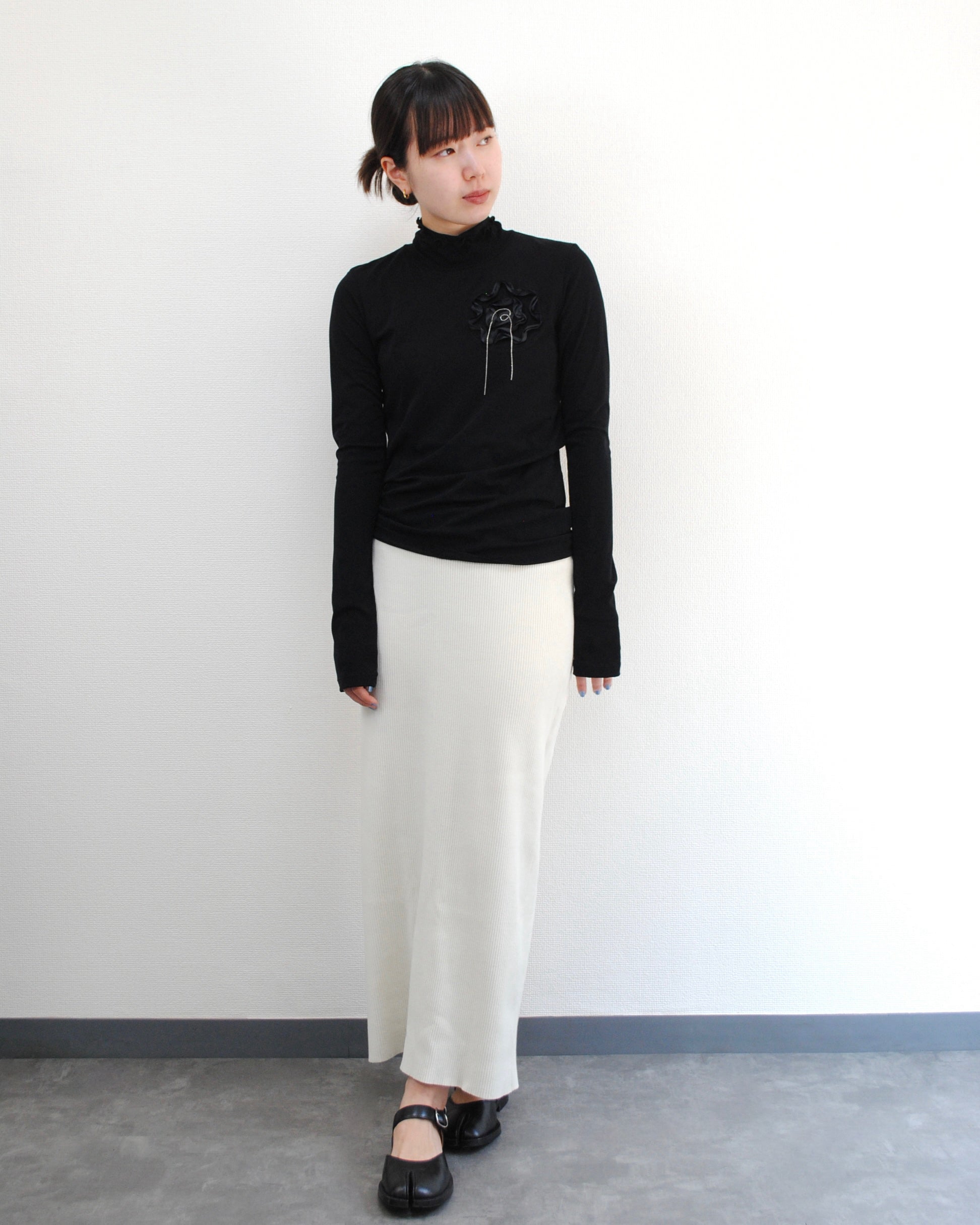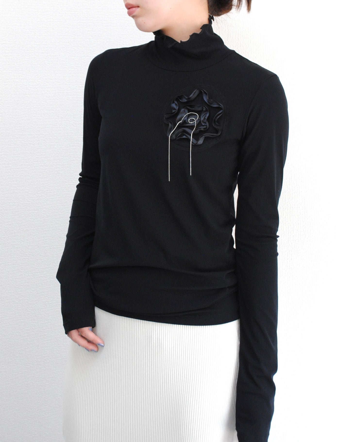 程よい透け感と存在感を併せ持つ、チュールのハイネックトップス。